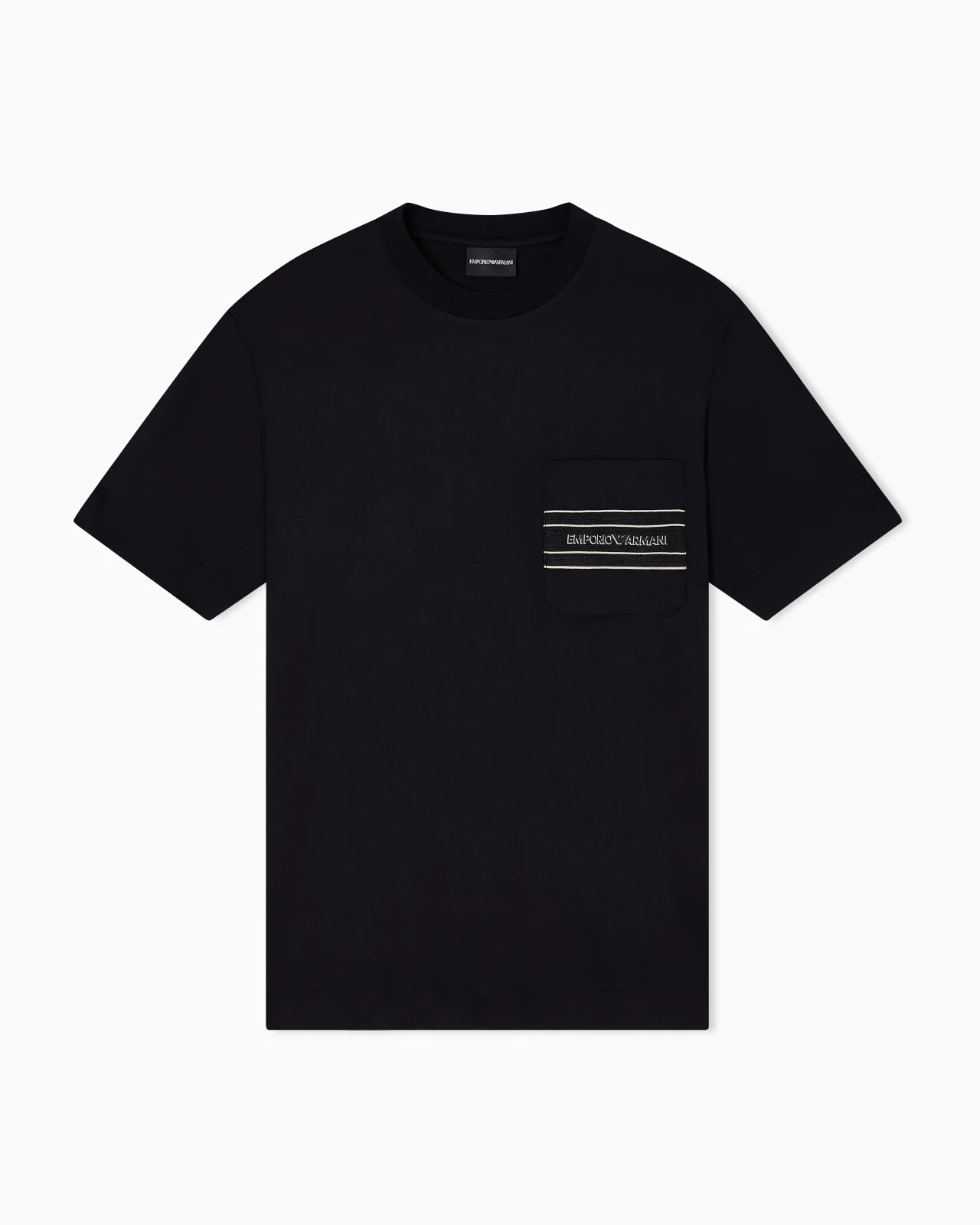 Cotton and Lyocell blend jersey crew-neck T-shirt. The piece features a patch pocket on the chest with a knit band insert, made distinctive by the Emporio Armani Milano logo print accompanied by the iconic eagle with an original three-dimensional effect with a chiaroscuro shaded appearance that enhances the 3D effect. Regular fit Jersey Crew neck Short sleeves Patch pocket Knit band on the pocket Logo print Product Code: EM002960AF18312UC001
