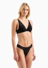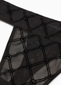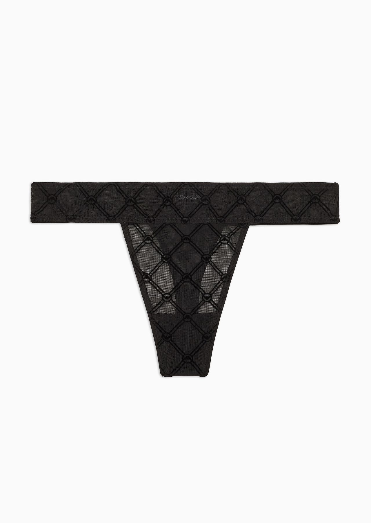 Thong with elasticated waist, made of transparent mesh fabric embellished with an all-over monogram logo using a flocking technique that creates a unique embossed effect with a velvety touch. Product Code: 1648954F205100020 Details Composition 94% Polyester 6% Elastane Mesh Flocked monogram Elasticated waist Fitting The model is 178 cm tall and is wearing size 40/S (Italian Size)
