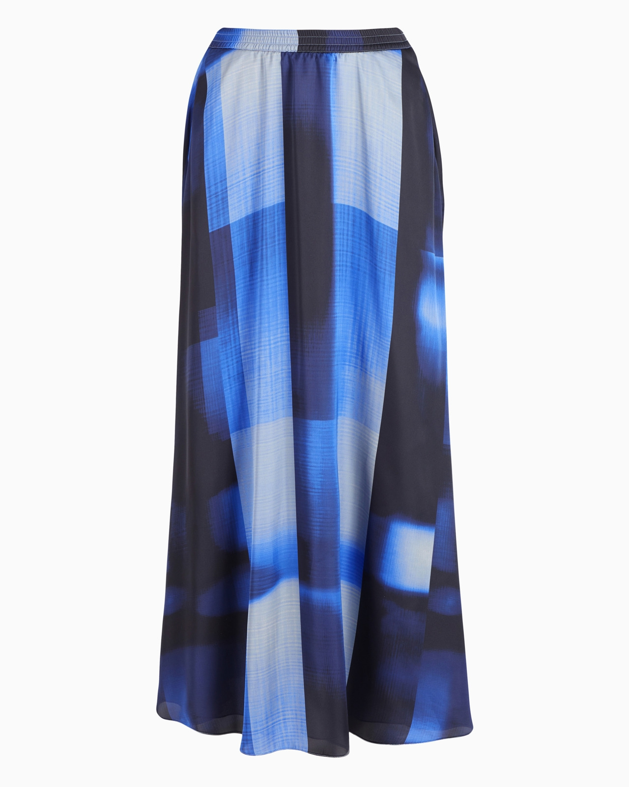 This long, elegant skirt with elasticated waist is crafted from sleek, flowing satin and is made unique by an all-over print that plays with shades of blue to create chiaroscuro effects. Product Code: EW000307TE111761MB013 Details Composition 100% Polyester Length: 95 cm Satin All-over print Elasticated waist Georgette lining Fitting The model is 178 cm tall and is wearing size 40/S (Italian Size)