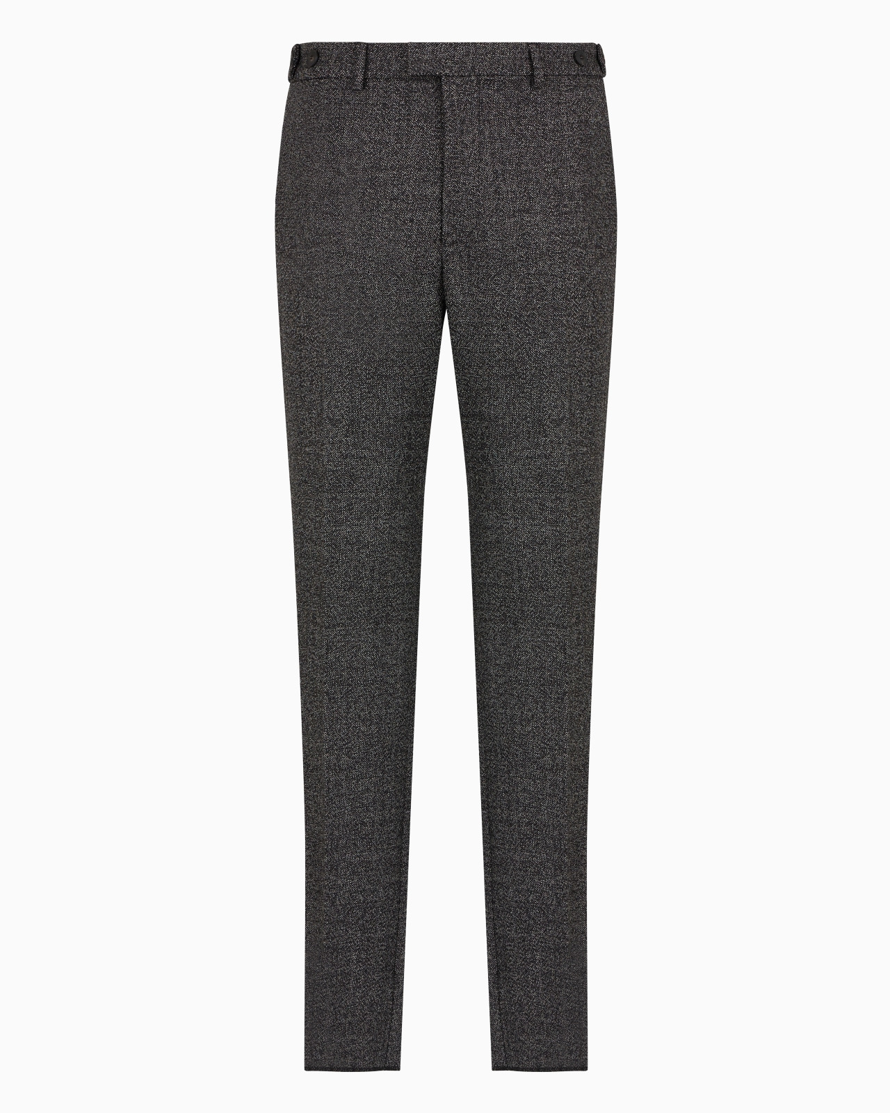 Trousers made of pure virgin wool grisaille, a brushed weave whose threads in different shades merge into a single colour, making the texture compact and particularly durable. The resulting fabric is characterised by a micro-textured weave that gives the entire garment a salt-and-pepper effect. Product Code: EM000275TE112221O8004 Details Composition 100% Virgin Wool Grisaille weave Waist with belt loops Zip, hook and button closure Waistband strap and button detail at the sides Side inseam pockets Back double-welt pocket Fitting The model is 188 cm tall and is wearing size 48/M (Italian Size)