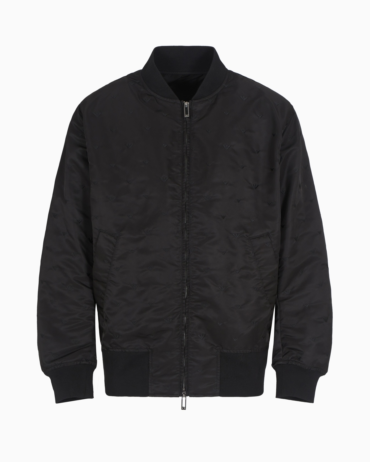 Bomber-collar blouson made from a nylon fabric with a shiny finish and distinguished by a series matching-tone micro eagles embroidered all over. Nylon Bomber-jacket collar Zip closure Long sleeves Side pockets with press studs Elasticated trim All-over logo embroidery Product Code: EM002244AF15344UC001