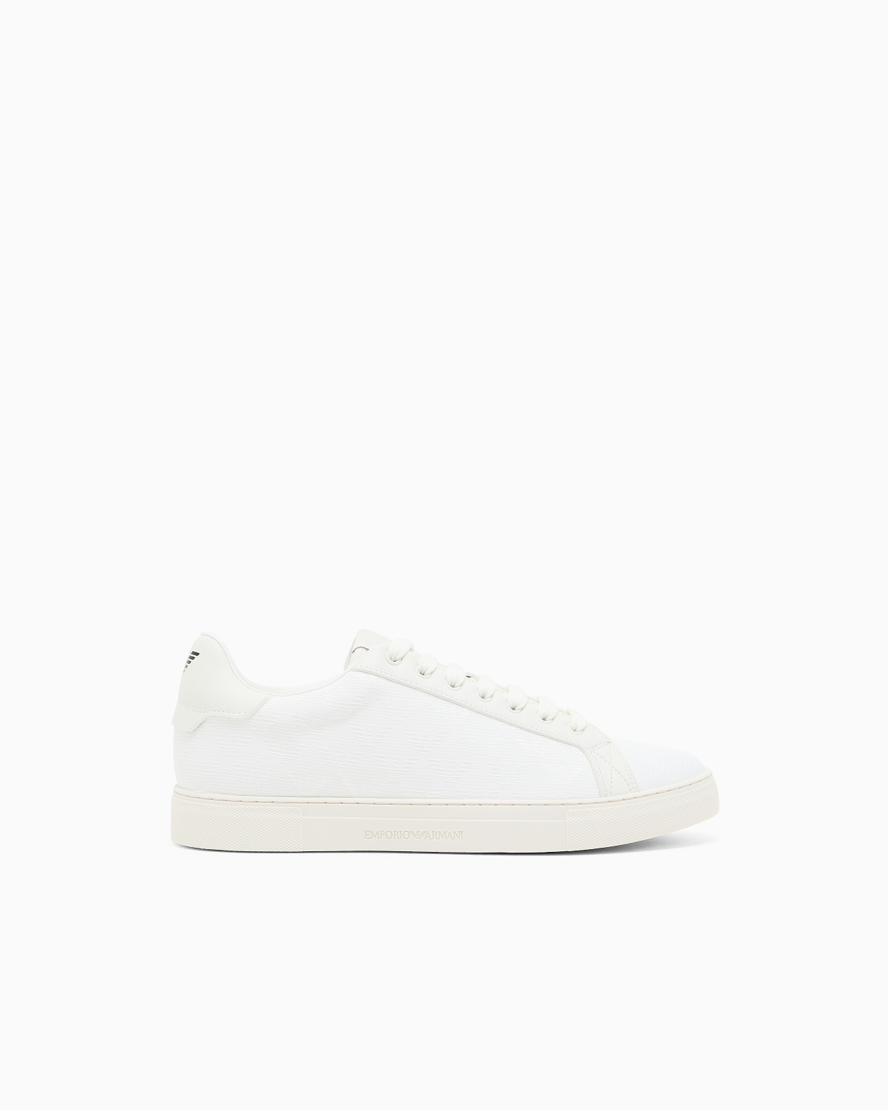 Jacquard nylon sneakers with matching enamelled eyelets on the uppers. These minimalist, modern sneakers are perfect for everyday city wear. This item features a tone-on-tone, all-over iconic eagle, along with leather details and back. This item belongs to the Essentials selection, the Emporio Armani capsule collection that is an evergreen statement of style: an ongoing collection with clean, well-designed shapes for a wardrobe that meets the demands of any season. Nylon uppers Jacquard All-over eagle Leather details Rounded toe Lace-up fastening Rubber soles Made in Italy Product Code: EM003843AF20003M0107