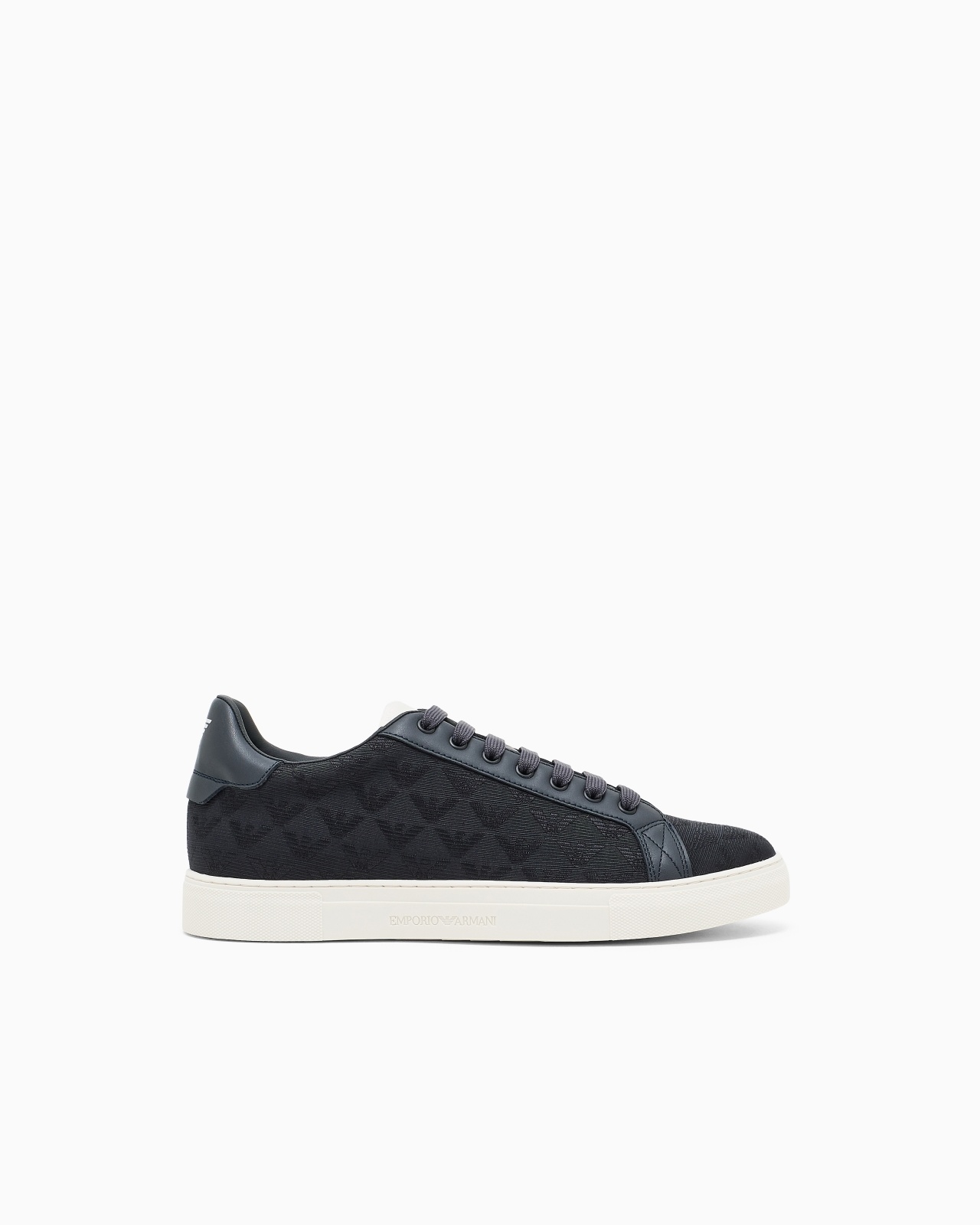 Jacquard nylon sneakers with matching enamelled eyelets on the uppers. These minimalist, modern sneakers are perfect for everyday city wear. This item features a tone-on-tone, all-over iconic eagle, along with leather details and back. This item belongs to the Essentials selection, the Emporio Armani capsule collection that is an evergreen statement of style: an ongoing collection with clean, well-designed shapes for a wardrobe that meets the demands of any season. Nylon uppers Jacquard All-over eagle Leather details Rounded toe Lace-up fastening Rubber soles Made in Italy Product Code: EM003843AF20003MB007