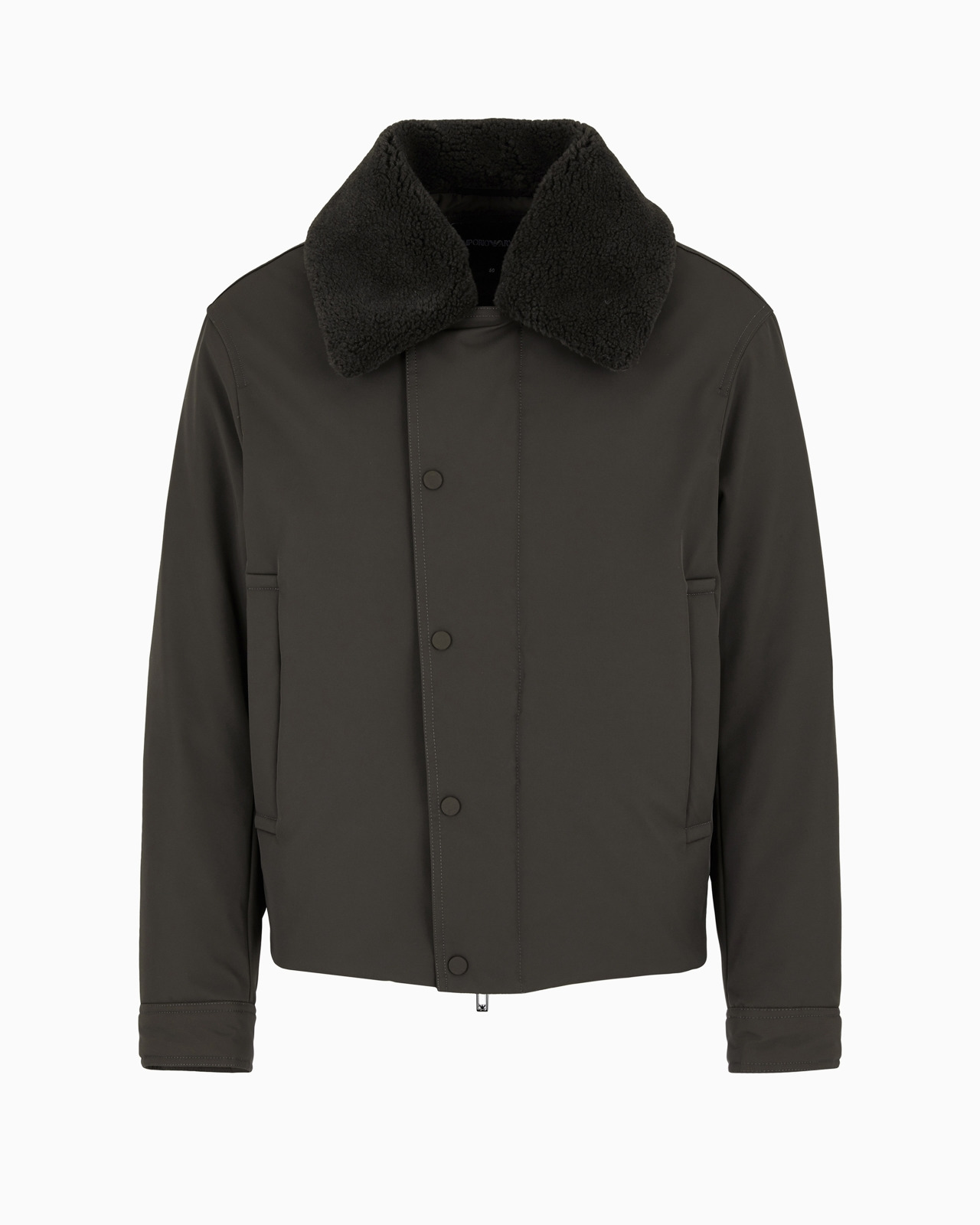 Jacket with large, sheepskin-effect collar that can be removed through a small button and has a concealed zip fastening and press studs. The twill-weave nylon texture, which combines polyamide fibres woven with spandex, is coated with a laminated film and an additional polyester layer that makes the fabric perfect for an outerwear piece with a clean, casual and modern flavour, while also ensuring unparalleled comfort, flexibility and durability. The garment is also distinguished by being water-repellent and super-comfortable, as stated on the stitched internal patch. Product Code: 6D1BC81NTLZ105A6 Details Composition 88% Polyamide 12% Elastane Nylon twill Detachable fur-effect collar Concealed zip and press-stud closure Fleece-lined side pockets Long sleeves Press studs on cuffs Fitting The model is 188 cm tall and is wearing size 48/M (Italian Size)