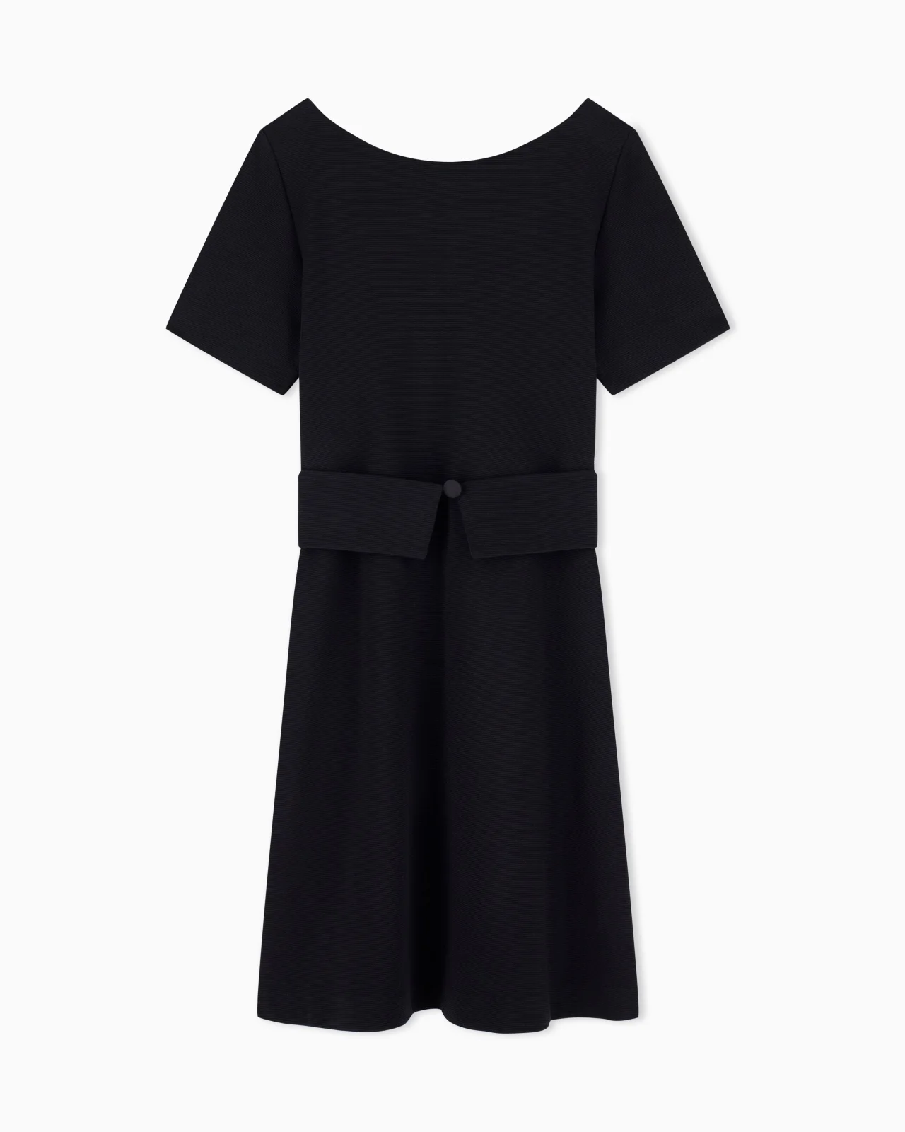 Flared dress made of ottoman jersey, a fabric that creates sophisticated raised ribbing across the whole garment. Its clean and sophisticated silhouette easily adapts to different styles, ensuring a consistently elegant and refined look. Length: 97 cm Ottoman jersey Rounded neckline Short sleeves Back zip closure Unlined garment Product Code: EW003530AF12364UC001