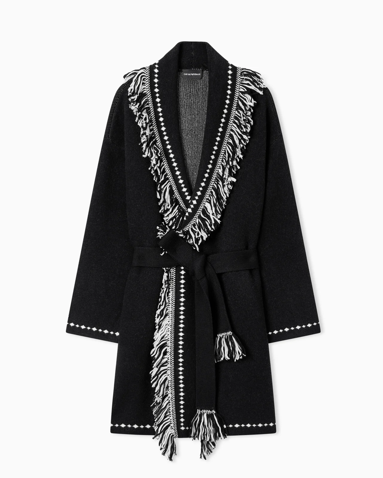 Oversized jacquard-knit cardigan featuring a shawl neckline with fringed edges and an all-over jacquard motif. Jacquard knit Shawl neckline with fringed edges Belted waist Long sleeves Product Code: EW004014AF25433MC005