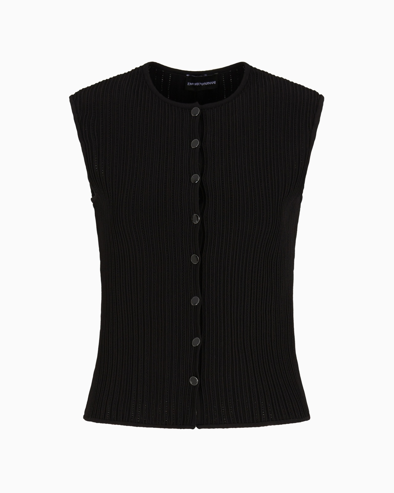 Knit waistcoat with front button fastening made of perforated, smooth ottoman fabric. The ottoman fabric creates refined raised ribs all over, making it unique and adaptable for multiple outfits. Ottoman fabric Crew neck Button closure Sleeveless Product Code: EW000950AF15109UC001