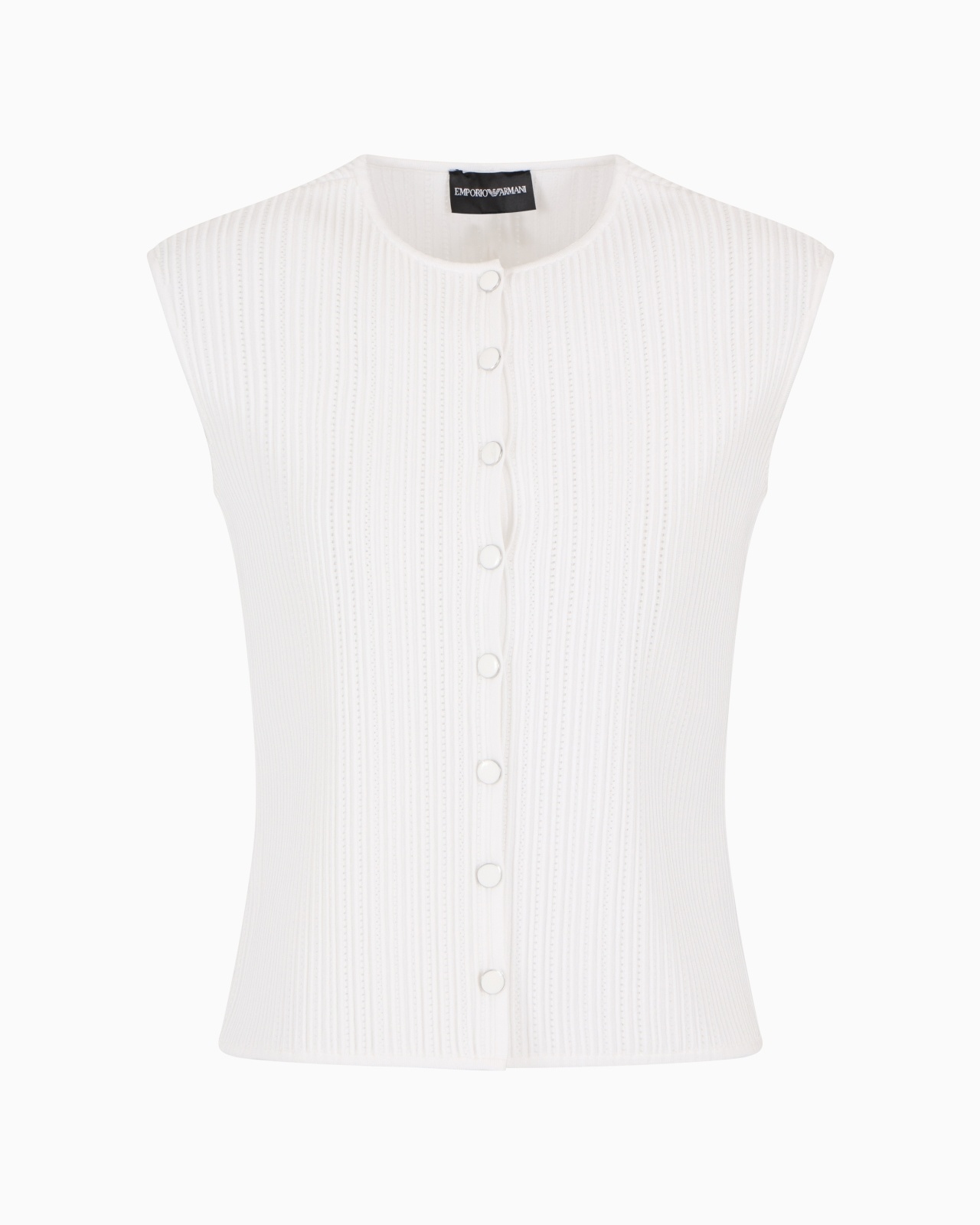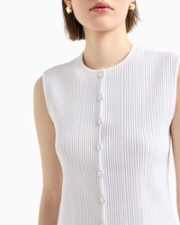 Knit waistcoat with front button fastening made of perforated, smooth ottoman fabric. The ottoman fabric creates refined raised ribs all over, making it unique and adaptable for multiple outfits. Ottoman fabric Crew neck Button closure Sleeveless Product Code: EW000950AF15109U0006