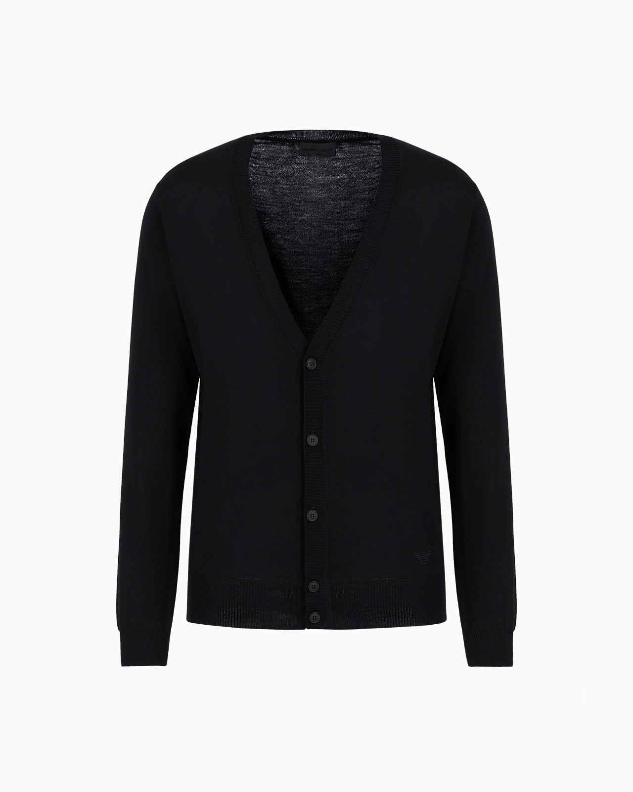 V-neck cardigan with classic front button closure. Made from plain-knit, pure virgin wool, it features a matching-tone, embroidered iconic eagle on the hem. This item belongs to the Essentials clothing selection, the Emporio Armani capsule collection that is a evergreen statement of a style: an ongoing collection with clean, well-designed shapes for a wardrobe that that meets the demands of any season. These “essential”, versatile pieces are a must-have for the male wardrobe. Made in Italy. Fineness: 14. Product Code: 8N1E211M67Z10999 Details Composition 100% Virgin Wool Lightweight knit V-neck Long sleeves Button closing Knitted Solid color Fitting The model is 6' and is wearing size M