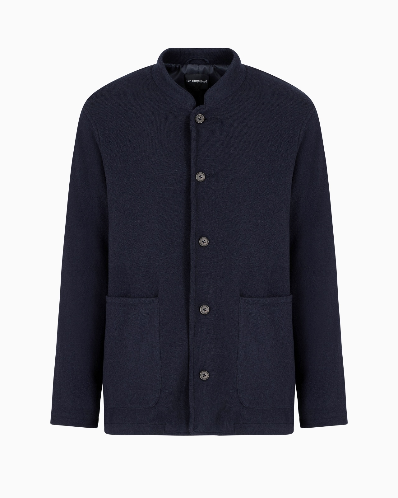 Blazer with iconic guru collar and front buttoning. The virgin-wool plated plain-knit weave makes a sophisticated yet casual statement. Plated plain knit Guru collar Front buttoning Long sleeves Side patch pockets Product Code: EM000603AF14211UB118