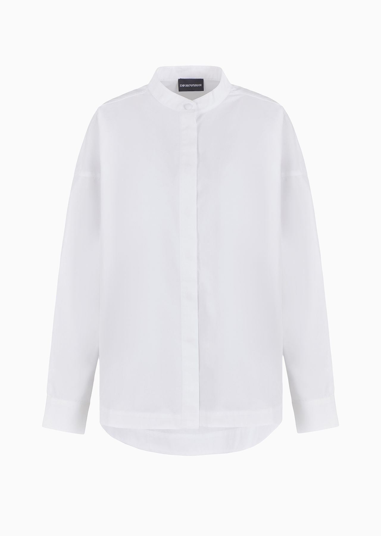 Polished pure cotton oversized shirt with iconic guru collar. The pleat at the back created by the darts accentuates the volume of the piece, adding character as soon as you wear it. Product Code: 6D2C732NN6Z10100 Details Composition 100% Cotton Polished cotton Guru collar Concealed buttoning Long sleeves Buttoned angled cuffs Visible buttons covered in matching fabric Back pleat Fitting The model is 178 cm tall and is wearing size 40/S (Italian Size)