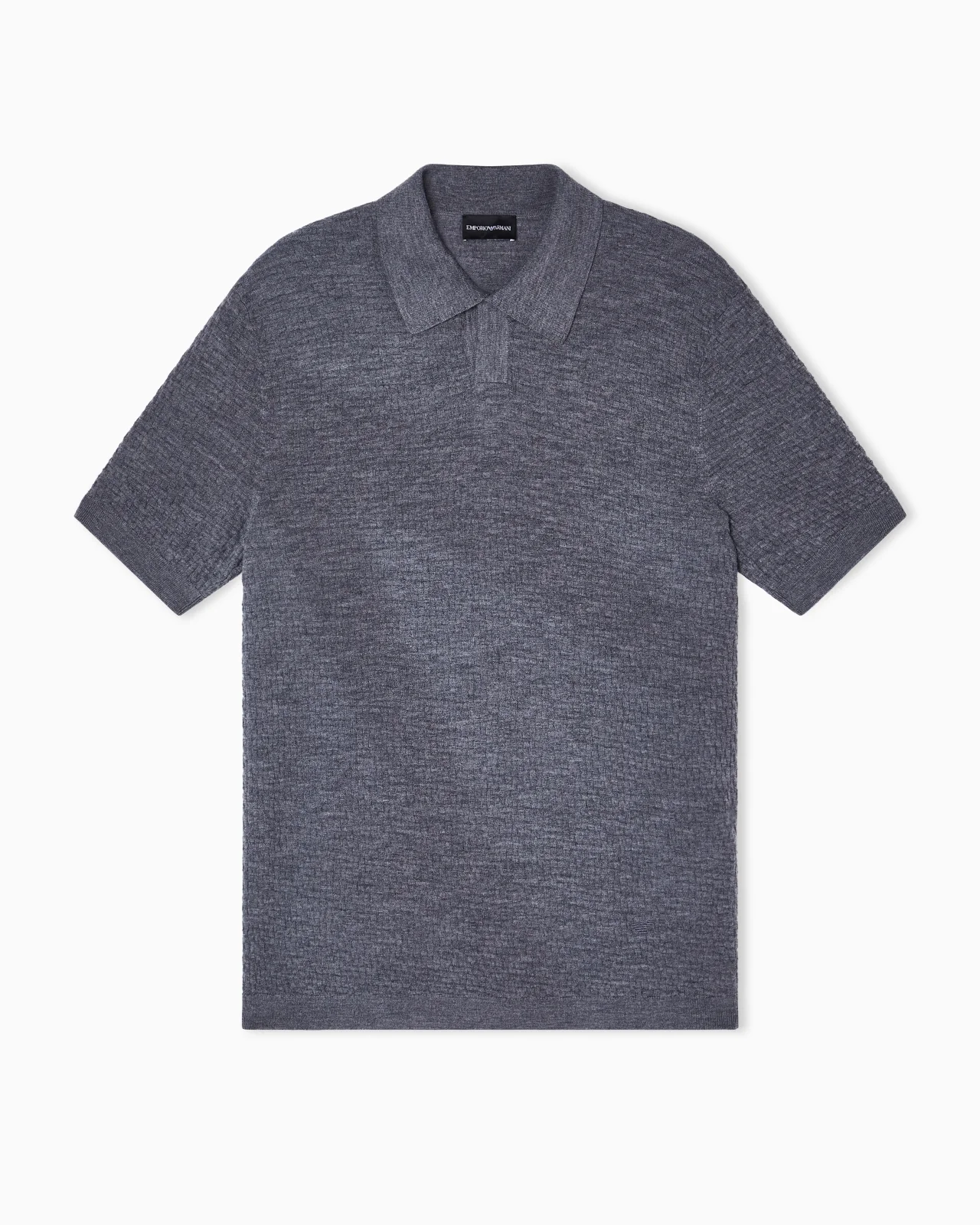 Short-sleeved jumper with a polo-shirt collar, made of virgin wool and featuring a plain-and-purl knit with an all-over raised check motif. Fineness: 16 Plain knit Check motif Polo-shirt collar Short sleeves Micro eagle embroidered on the left hem Product Code: EM004312AF23757O8003