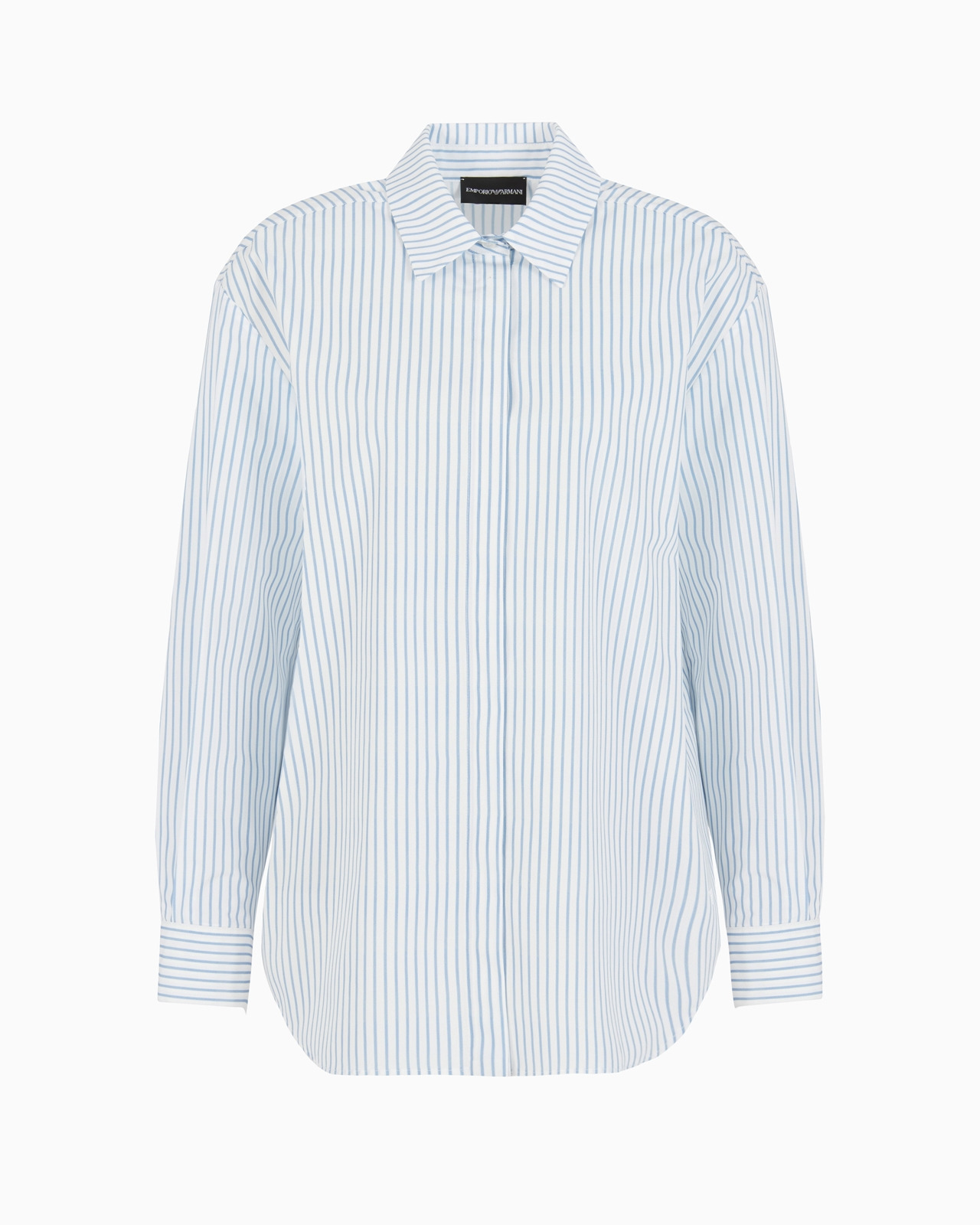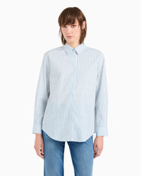Fresh, pure cotton-poplin shirt with classic collar. A piece that adds a casual touch to any look, while the masculine cut confirms its modern allure. Product Code: 6D2C722N0FZ1F125 Details Composition 100% Cotton Poplin Classic collar Mother-of-pearl button at the neckline Concealed buttoning Long sleeves Single-buttoned cuffs Micro eagle embroidered on the left hem Fitting The model is 178 cm tall and is wearing size 40/S (Italian Size)