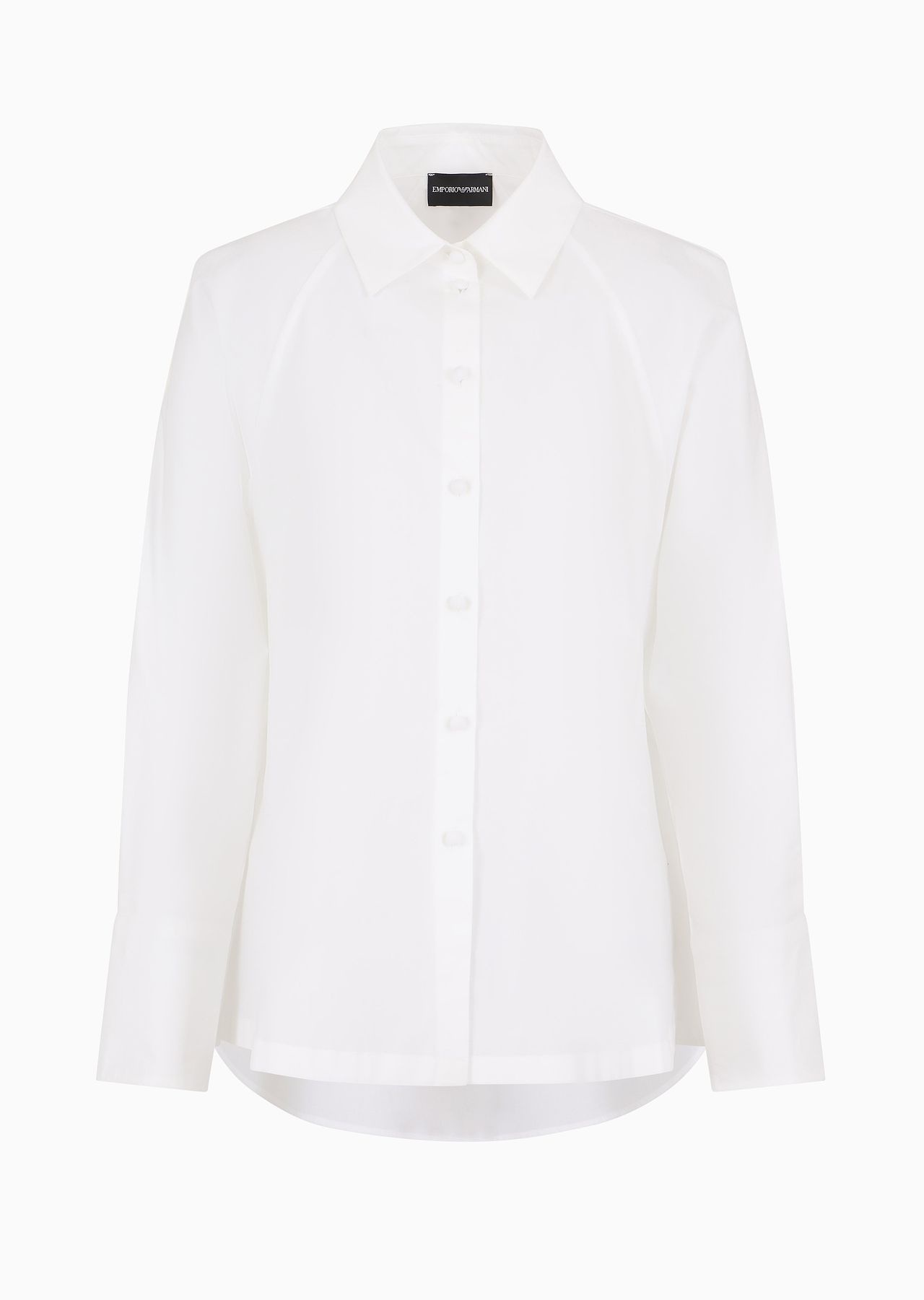 Shirt with classic collar, asymmetric hem and original stretch peplum that can be opened via a button at the back. Made from crisp pure cotton poplin, it adds a summery touch to every look, while the comfortable fit confirms its modern attitude. Product Code: 6D2C692N0FZ10100 Details Composition 100% Cotton Poplin Classic collar Closure with covered buttons in matching fabric Long sleeves Cuffs with button and darts Asymmetric hem Stretch peplum with button at the back Fitting The model is 178 cm tall and is wearing size 40/S (Italian Size)