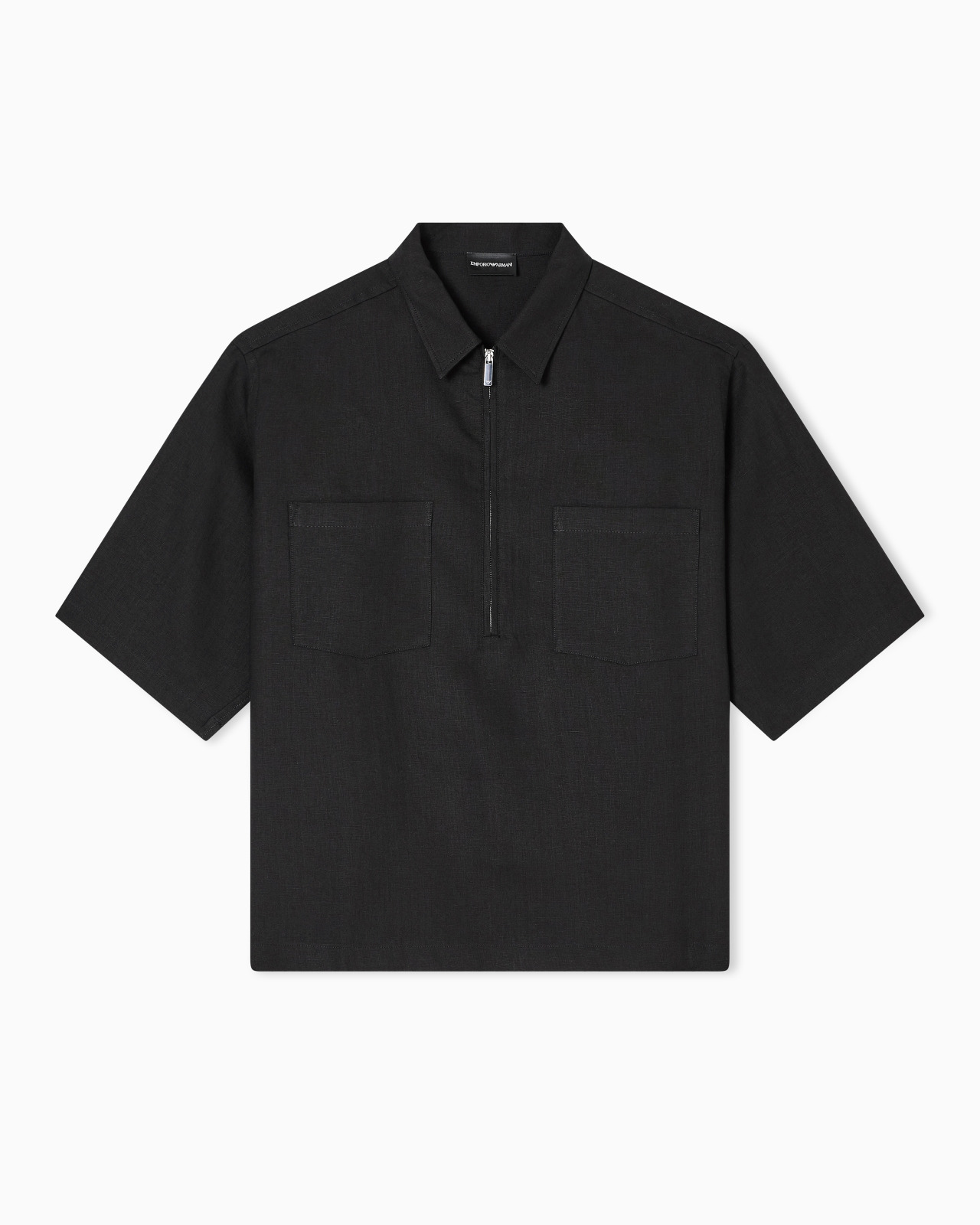 Short-sleeved shirt with partial zip closure. Made of 100% linen fabric, with a luxurious freshness that harmoniously enhances its essential lines, this style is an instant must-have for the transitional wardrobe. Classic collar Partial zip Short sleeves Patch pockets Product Code: EM002814AF18000UC001