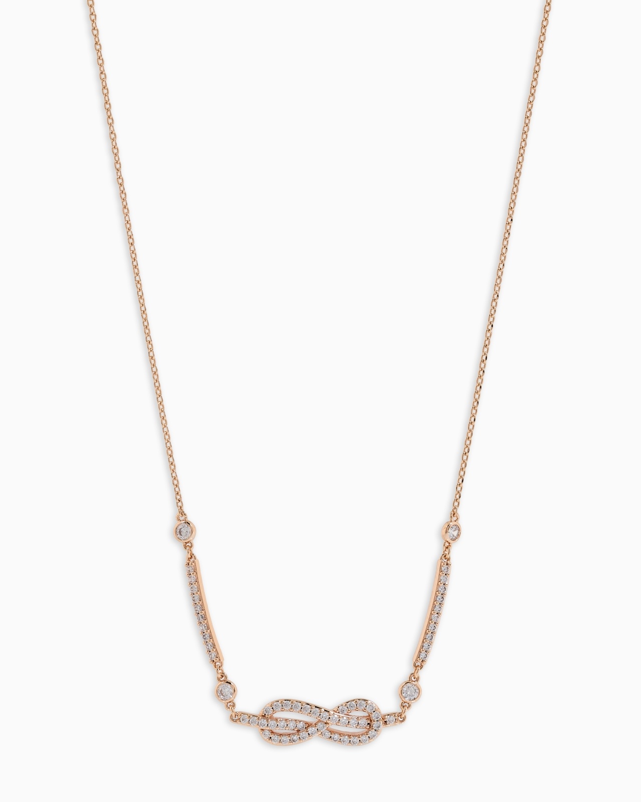 This station necklace features rose gold-tone brass, white cz and a lobster clasp closure. Necklace Station Brass Rose Gold Length: 350mm + 70mm, Width: 21.5mm, Height: 6.3mm Product Code: EGS3108221NLPNLC