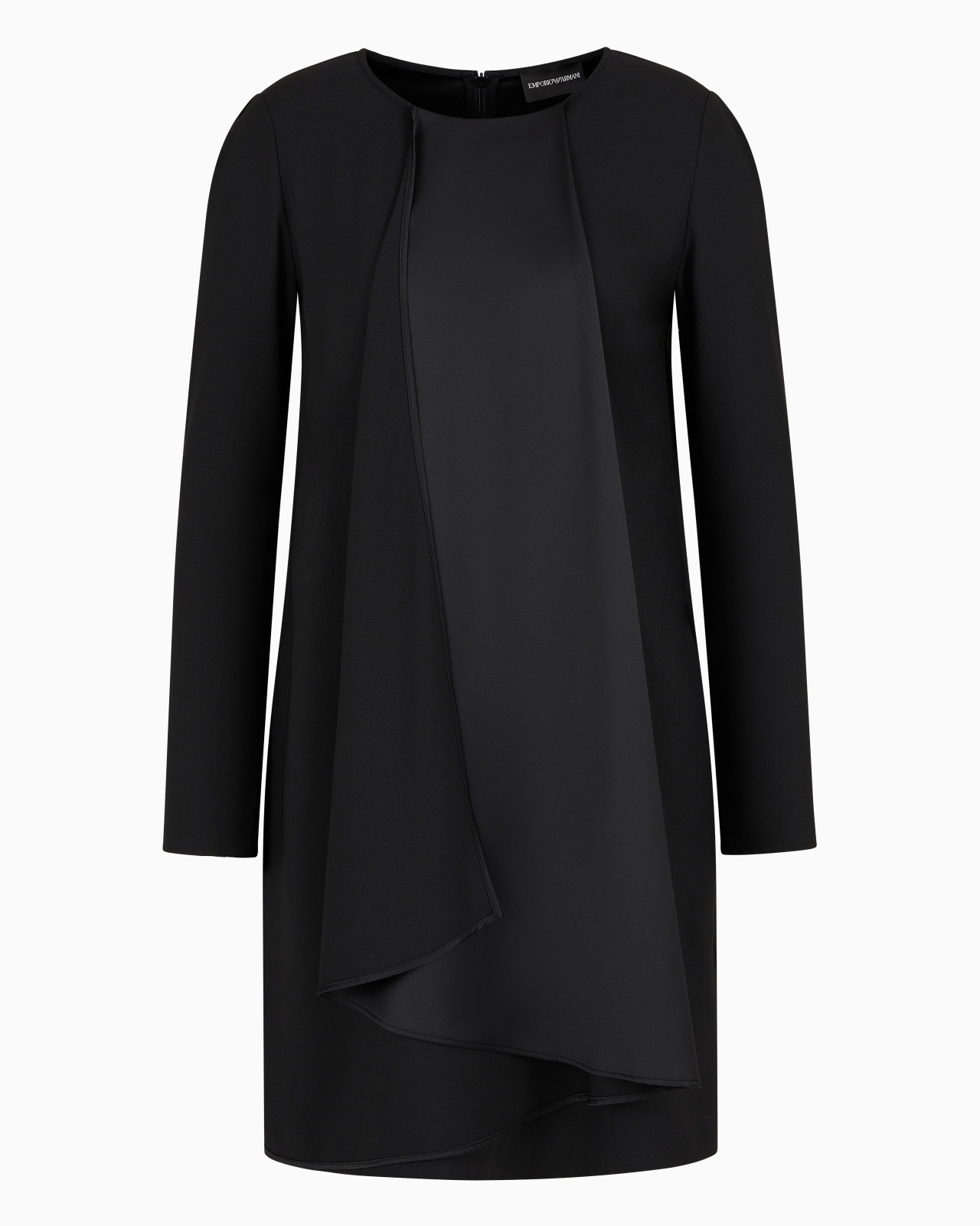 Crew-neck dress made of satin crepe using the matte side of the fabric, featuring an oversized shiny ruffle on the front that creates a panel with a wrap-effect pleat, adding femininity and movement to the piece. Product Code: 6D2A632NA5Z10999 Details Composition 100% Polyester Crepe satin Crew neck Long sleeves Front panel Side pockets Concealed zip fastening at the back Fitting The model is 178 cm tall and is wearing size 40/S (Italian Size)