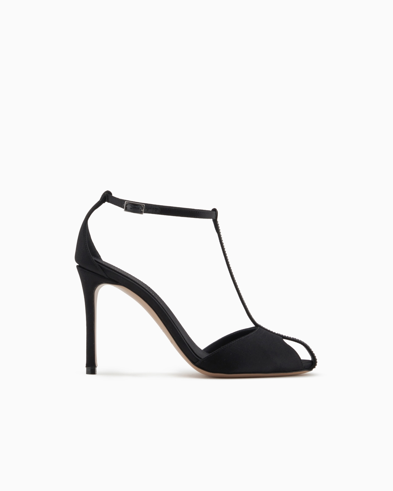 Heeled sandals with an ankle strap, made of satin and embellished with a T-bar upper with matching-tone rhinestone details that add a touch of light to this sophisticated footwear, perfect for completing evening outfits. Heel height: 9.5 cm Satin T-bar upper with rhinestones Ankle strap Made in Italy Product Code: X3P853XR385R680