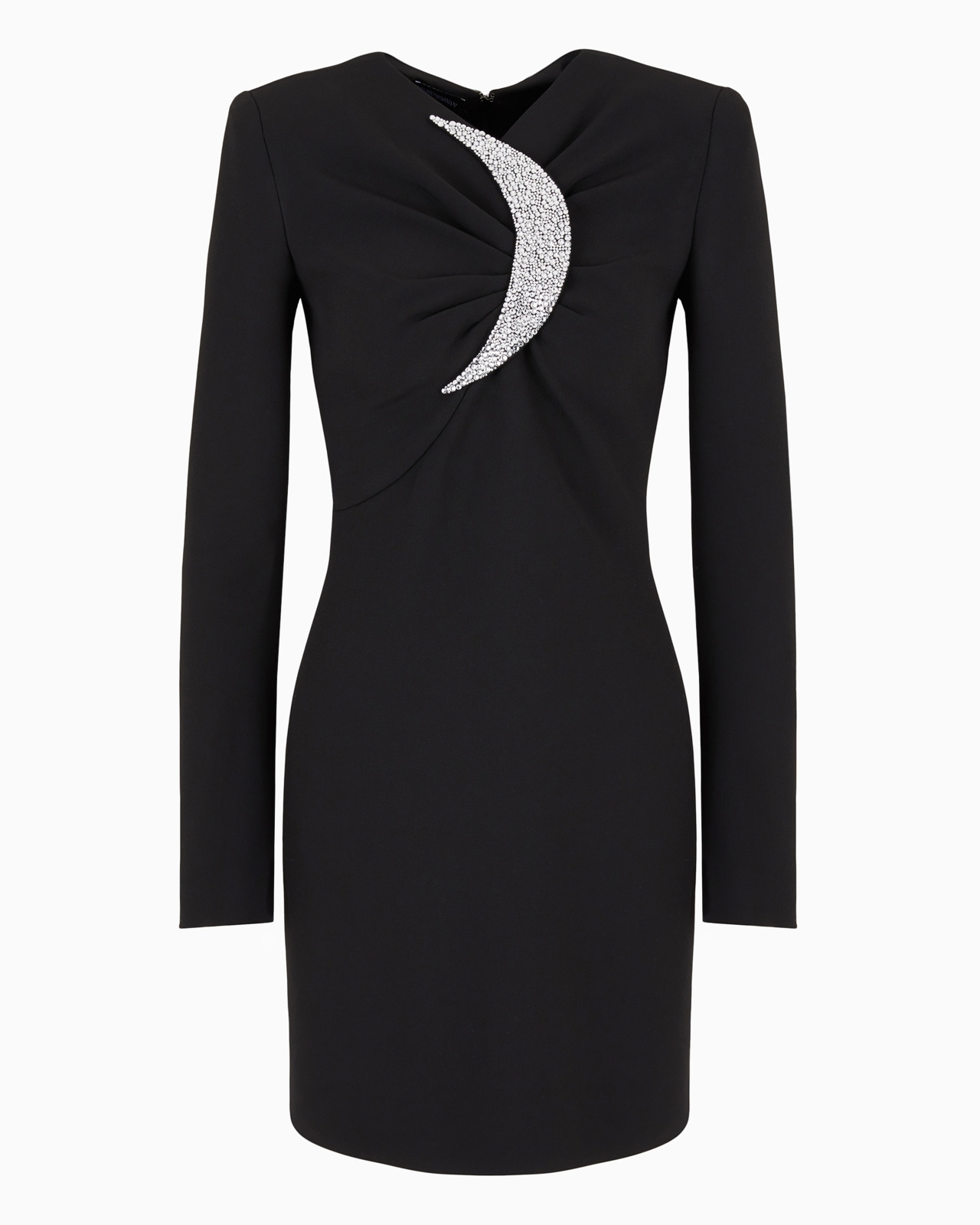 Sheath dress in crepe cady featuring draping at the chest and an oversized crescent-moon decoration covered with all-over rhinestones. The item belongs to the exclusive Moon Capsule collection in which rhinestones and sparkling details recreate lunar and star elements on deep, dark backgrounds, embellishing the pieces in the selection with touches of brilliance. Elongated silhouettes glide through the moonlight in mysterious, nocturnal settings. Milky accents, similar to a starry sky, light up dark velvets, while the sparkle of sequins makes dresses shine and elevates tops, giving them a feminine, elegant and dreamy allure. Product Code: EW000306TE104181UC001 Details Composition 50% Viscose 47% Acetate 3% Elastane Cady crepe Front draping Oversized decoration with rhinestones Long sleeves Cuffs with invisible zip Concealed zip fastening at the back Fitting The model is 178 cm tall and is wearing size 40/S (Italian Size)