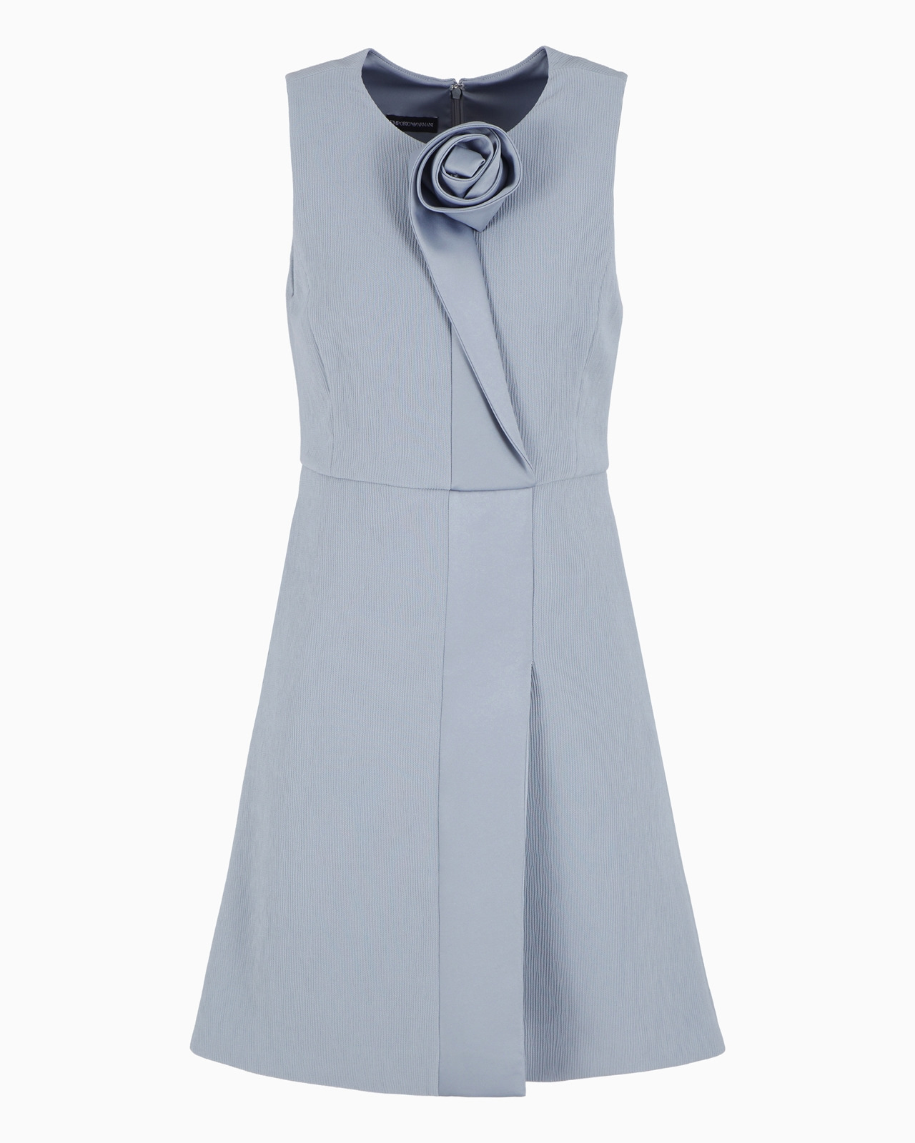Sleeveless dress with flared design, made of stretch technical fabric with a particularly textured weave created by the embossed ribs that result in a unique, dense wave-effect motif. The style is embellished with a rose-shaped satin flower detail applied at the neck. Product Code: EW000089AF102361U8061 Details Composition 96% Polyester 4% Elastane Stretch technical fabric Ribbed weave Rounded neckline Applied satin flower detail Sleeveless Front panel Back concealed zip Satin lining Fitting The model is 178 cm tall and is wearing size 40/S (Italian Size)