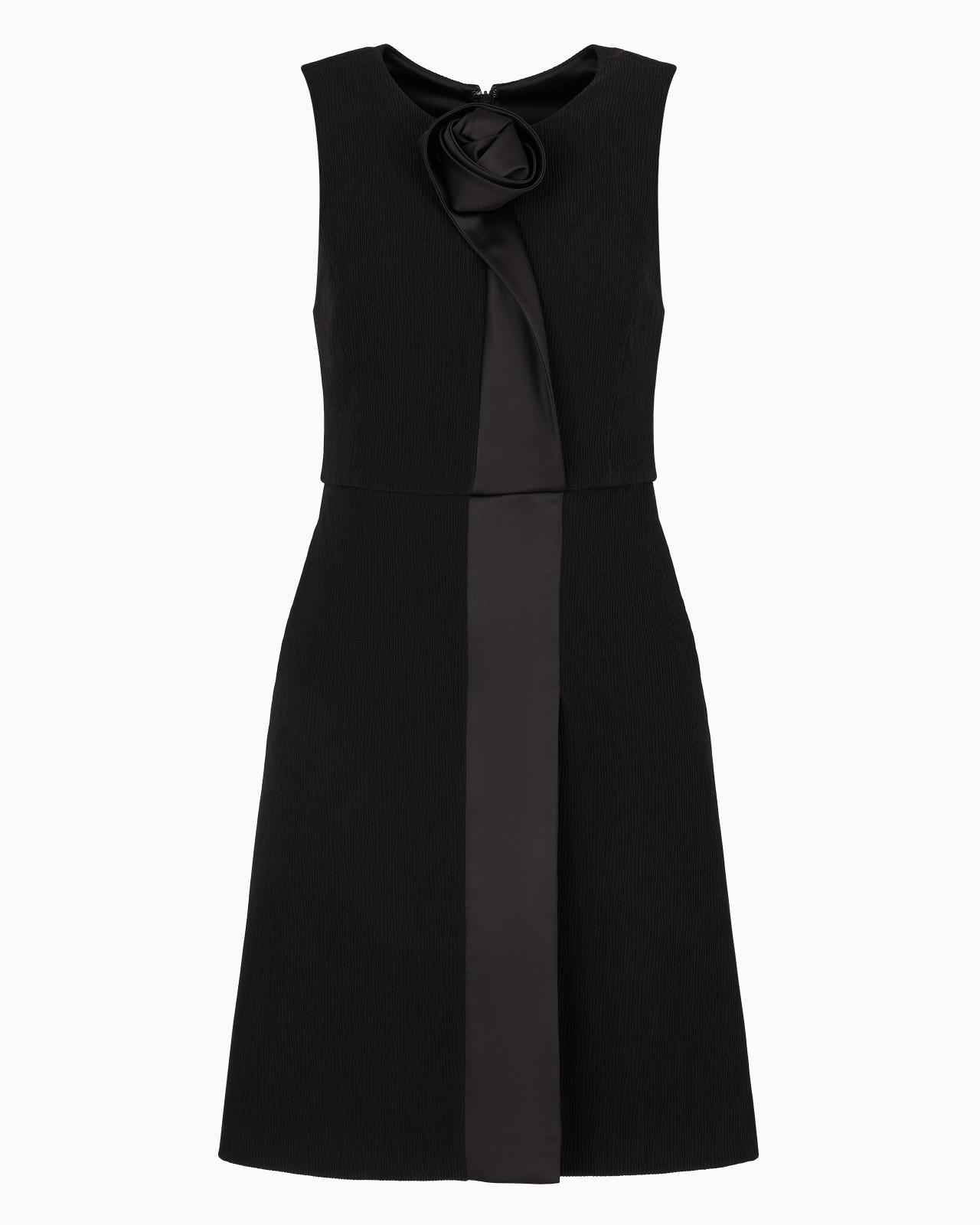 Sleeveless dress with flared design, made of stretch technical fabric with a particularly textured weave created by the embossed ribs that result in a unique, dense wave-effect motif. The style is embellished with a rose-shaped satin flower detail applied at the neck. Product Code: EW000089AF102361UC001 Details Composition 96% Polyester 4% Elastane Stretch technical fabric Ribbed weave Rounded neckline Applied satin flower detail Sleeveless Front panel Back concealed zip Satin lining Fitting The model is 178 cm tall and is wearing size 40/S (Italian Size)