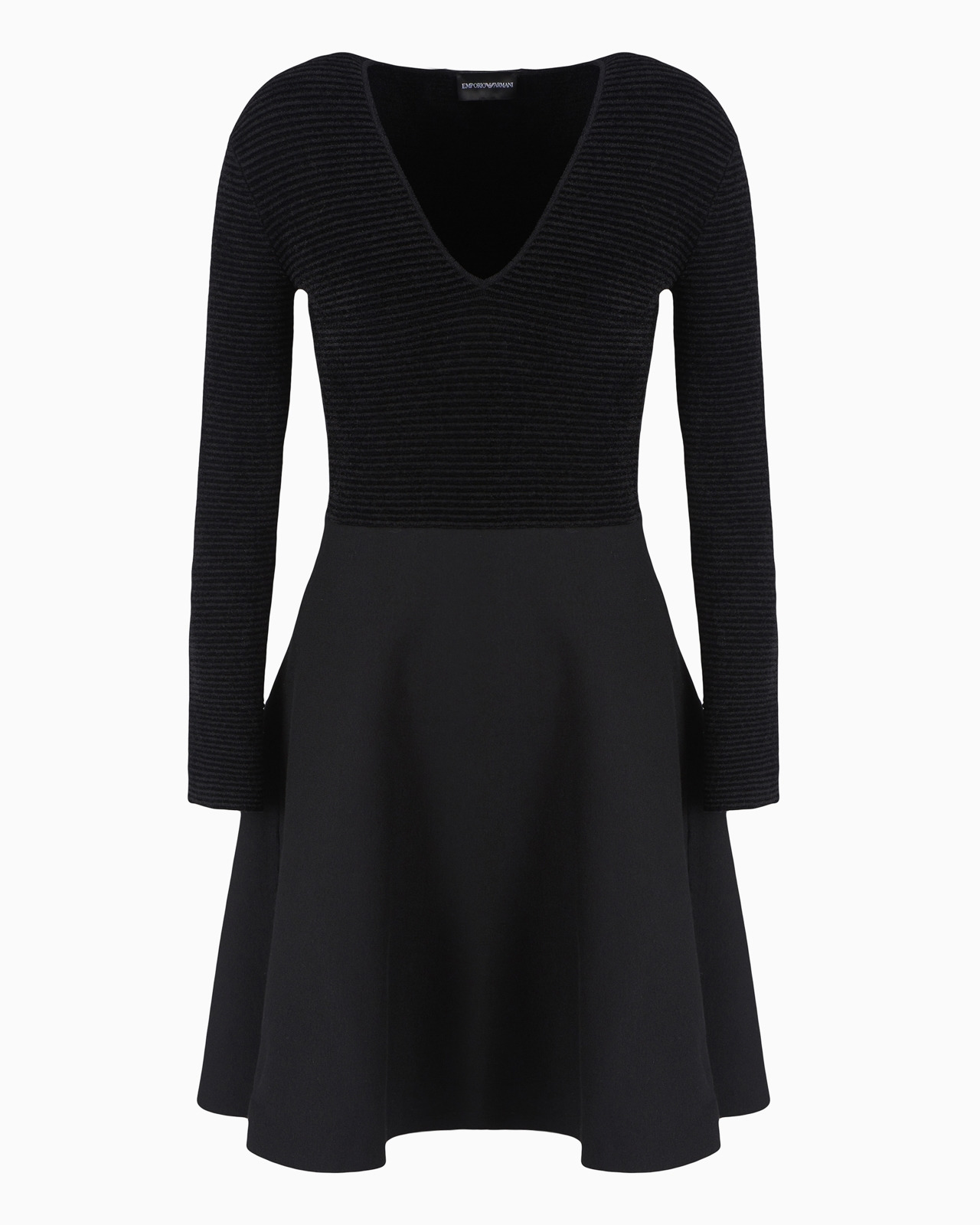 V-neck dress made in different materials for the top and bottom. The ottoman weave creates sophisticated raised ribs that run over the top section of the style, while the wide skirt is in a knit fabric that has a particularly compact and smooth feel. Product Code: 6D2ATB2M21Z10999 Details Composition 48% Viscose 39% Polyamide 11% Polyester 2% Elastane Ottoman fabric for the upper part V neck Long sleeves Knit fabric skirt Fitting The model is 178 cm tall and is wearing size 40/S (Italian Size)