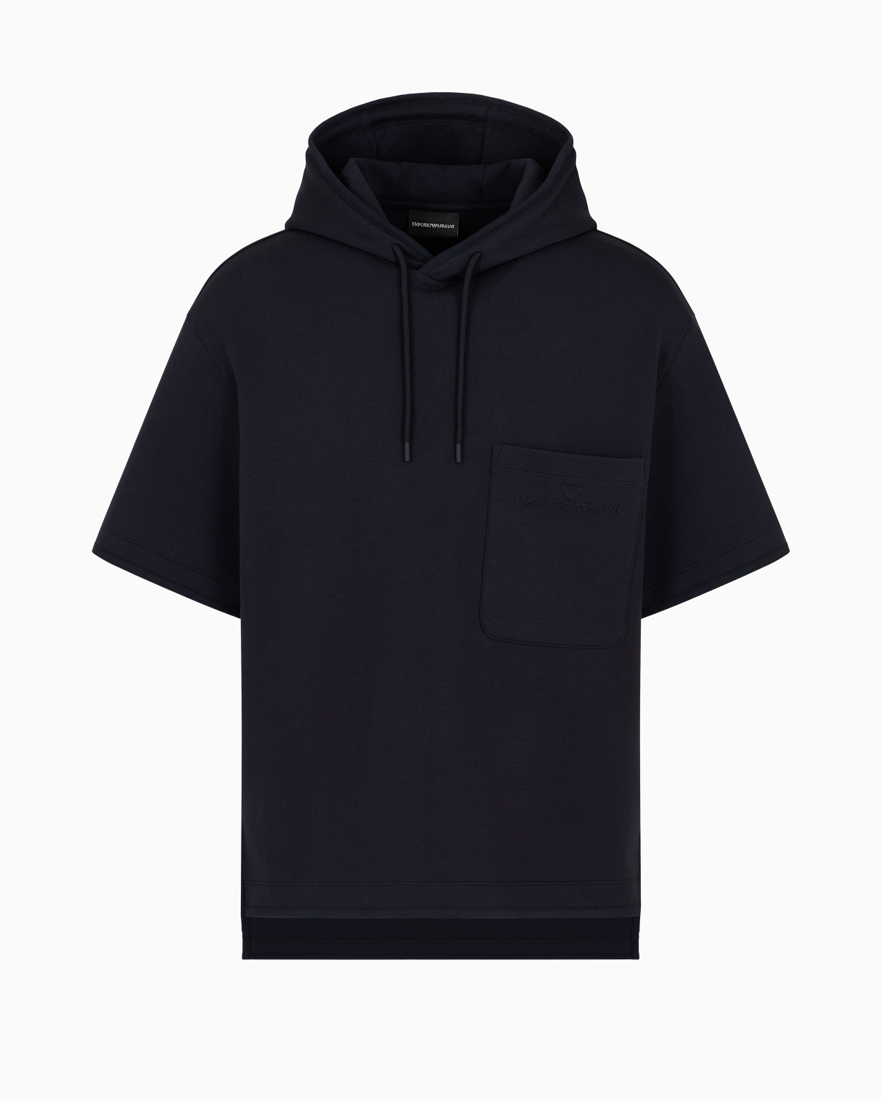 Short-sleeved sweatshirt with a drawstring hood and front patch pocket on the chest. Made of cosy double jersey, it features side slits at the hem and an embossed domed logo on the pocket that makes the style distinctive. Product Code: 6D1MC51JHSZ10920 Details Composition 76% Cotton 18% Polyester 6% Elastane Double jersey Drawstring hood Short sleeves Logo patch pocket Domed logo Side slits at the hem Fitting The model is 188 cm tall and is wearing size 48/M (Italian Size)