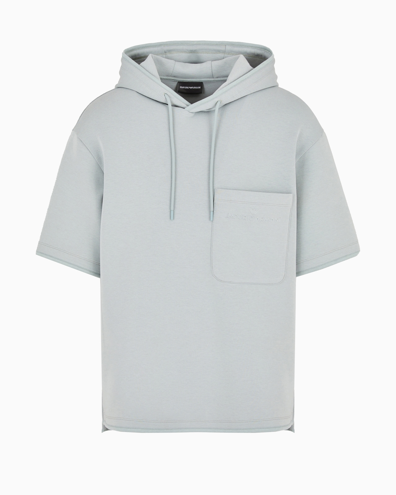 Short-sleeved sweatshirt with a drawstring hood and front patch pocket on the chest. Made of cosy double jersey, it features side slits at the hem and an embossed domed logo on the pocket that makes the style distinctive. Product Code: 6D1MC51JHSZ106J9 Details Composition 76% Cotton 18% Polyester 6% Elastane Double jersey Drawstring hood Short sleeves Logo patch pocket Domed logo Side slits at the hem Fitting The model is 188 cm tall and is wearing size 48/M (Italian Size)