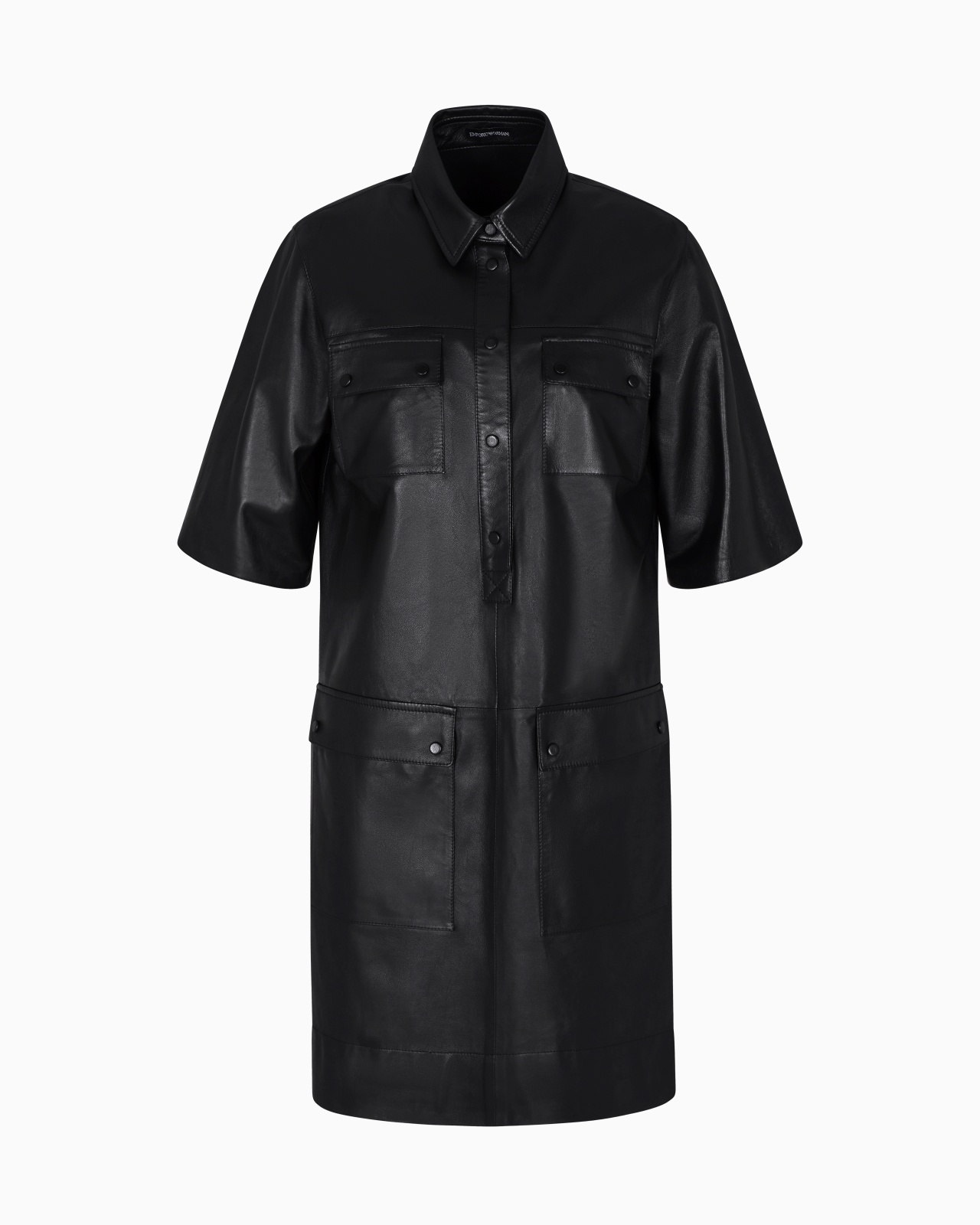 Dress with a classic collar, partial press-stud closure and wide short sleeves, made of exquisite 82% biodegradable nappa lambskin that is compostable and metal-free. The regular-fit style has practical patch pockets with a flap and press studs. Express your femininity in this dress that can be worn on a wide array of occasions. Nappa leather Classic collar Partial closure with leather-covered press studs Short sleeves Patch pockets with flap and press studs Unlined garment Product Code: EW002151AF17166UC001