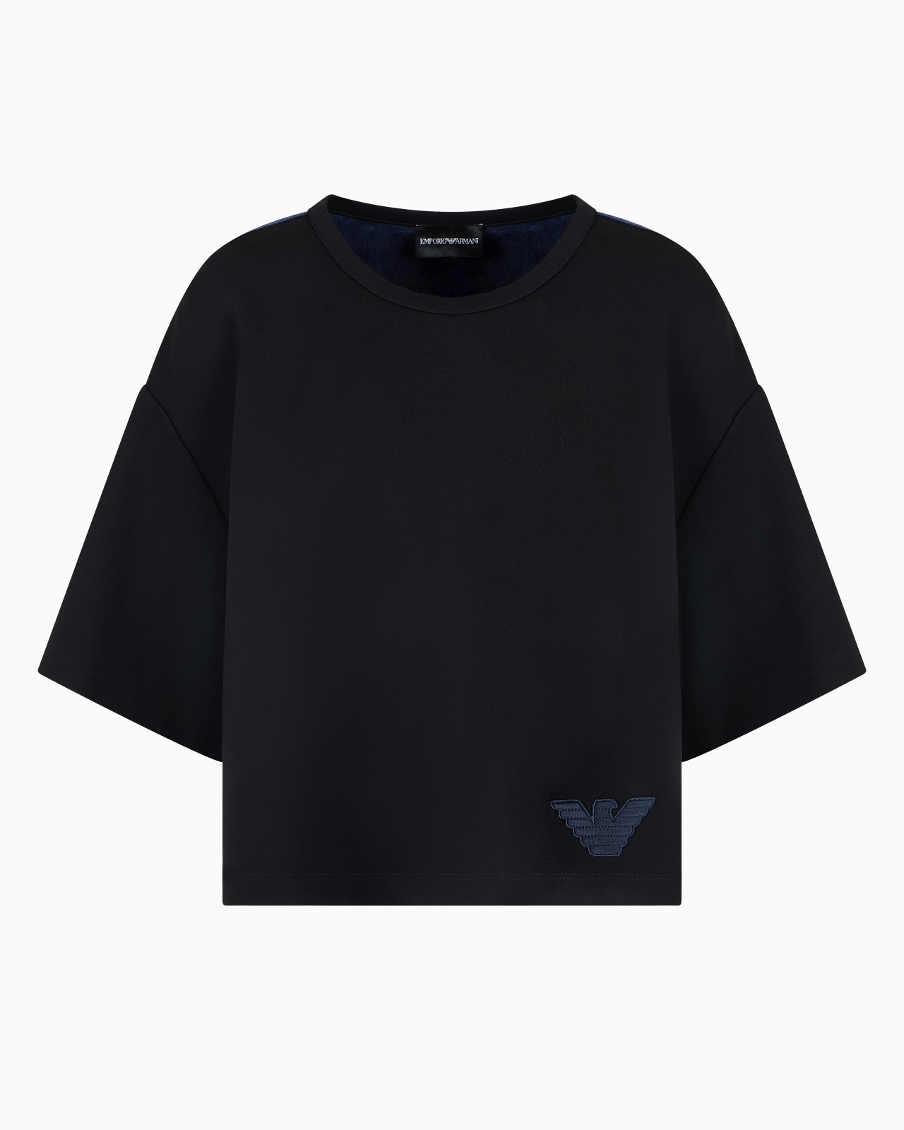 Round-neck, short-sleeved sweatshirt made of interlock jersey, a fabric with a fine, dense, extremely compact weave, making it especially warm, stretchy and durable. The piece features an iconic eagle embroidered on the left hem with a quilted nylon interior and a crinkle-effect cupro back. Stretch-jersey front Rounded neckline Short sleeves Eagle logo embroidery Cupro back Product Code: EW000488AF12911UC001