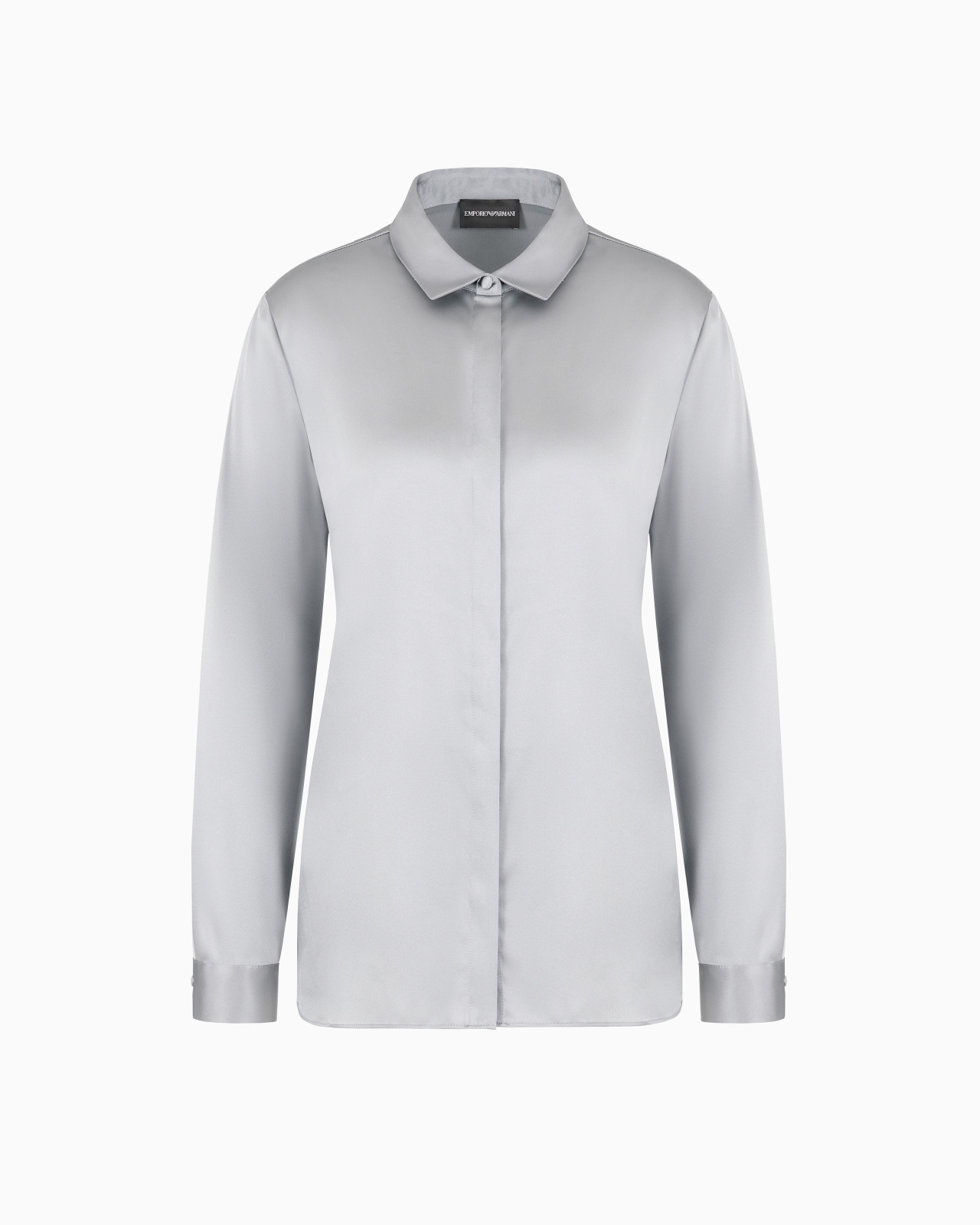 Classic-collar shirt made of exquisite silk satin with a natural sheen that adds charm to even the most basic outfits. Product Code: 8N2C392NXXZ1U8047 Details Composition 94% Mulberry silk 6% Elastane Silk satin Classic collar Covered button for collar closure Concealed buttoning Long sleeves Cuffs with covered buttons Fitting The model is 178 cm tall and is wearing size 40/S (Italian Size)