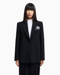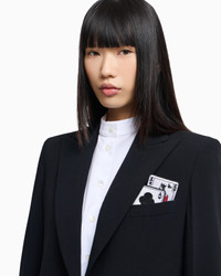 Single-breasted blazer with a peak lapel collar made of envers satin, a fluid fabric that glides softly over the silhouette. The style is distinguished by the removable playing-cards detail in the pocket-square pocket and the jacquard lining in the collection pattern. The intriguing world of playing cards is the theme running through this season’s women’s collection. The Jeu de Cartes theme is playfully interpreted in different details of the collection: the elegance and refinement of Emporio Armani intertwine with the classic symbols of the playing-card suits, together with intense and vibrant colours that combined with softer shades create looks with a mysterious and sophisticated allure. Envers satin Single-breasted Peak lapels Press-stud closure Long sleeves Pocket-square pocket Playing cards detail removable by press studs Double-welt side pockets Back vents Collection motif jacquard lining Product Code: EW002636TE10419UC001