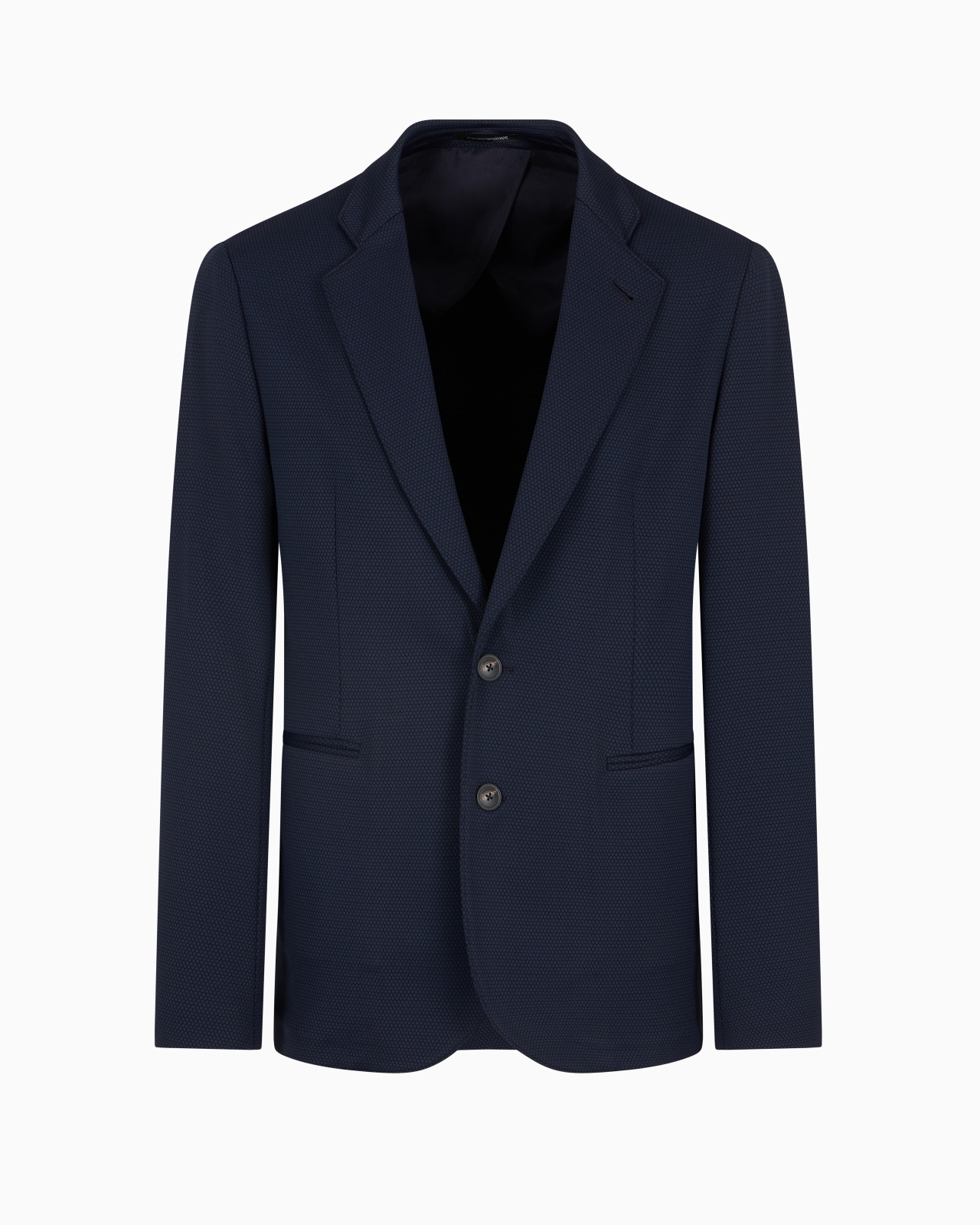 Single-breasted blazer with notched lapels, made of a dense and enveloping technical jersey and featuring a special waffle-effect weave typical of pique which, soft-textured and fresh, adds understated elegance to everyday wear. Stretch jersey Pique weave Single-breasted Lapel collar Two-button closure Long sleeves Side welt pockets Partially lined Product Code: EM001665TE13591UB081