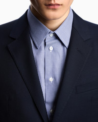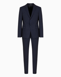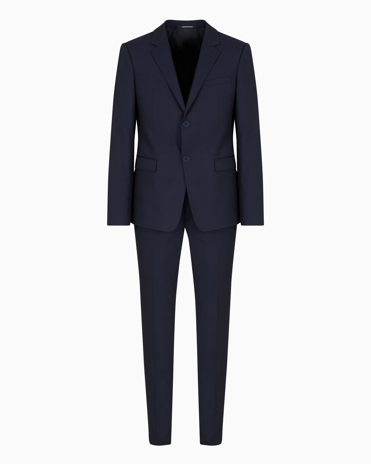 Slim-fit suit consisting of a single-breasted jacket with notched lapels and sleeve head rolls that make the silhouette more modern and defined, and classic-fit matching trousers. Made of light pure virgin wool and embellished with a monochromatic micro-effect jacquard, it is perfect for a wide array of evening events and formal occasions. Slim fit Drop: 7 Single-breasted jacket Jacket length: 71.5 cm Notched lapels Two-button closure Long sleeves Pocket-square pocket Side welt pockets with flap Back centre vent Lined garment Trousers without pleats Waist with belt loops Zip and button closure Ankle cuffs: 17.5 cm Made in Italy Product Code: EM000455TE10425UB115