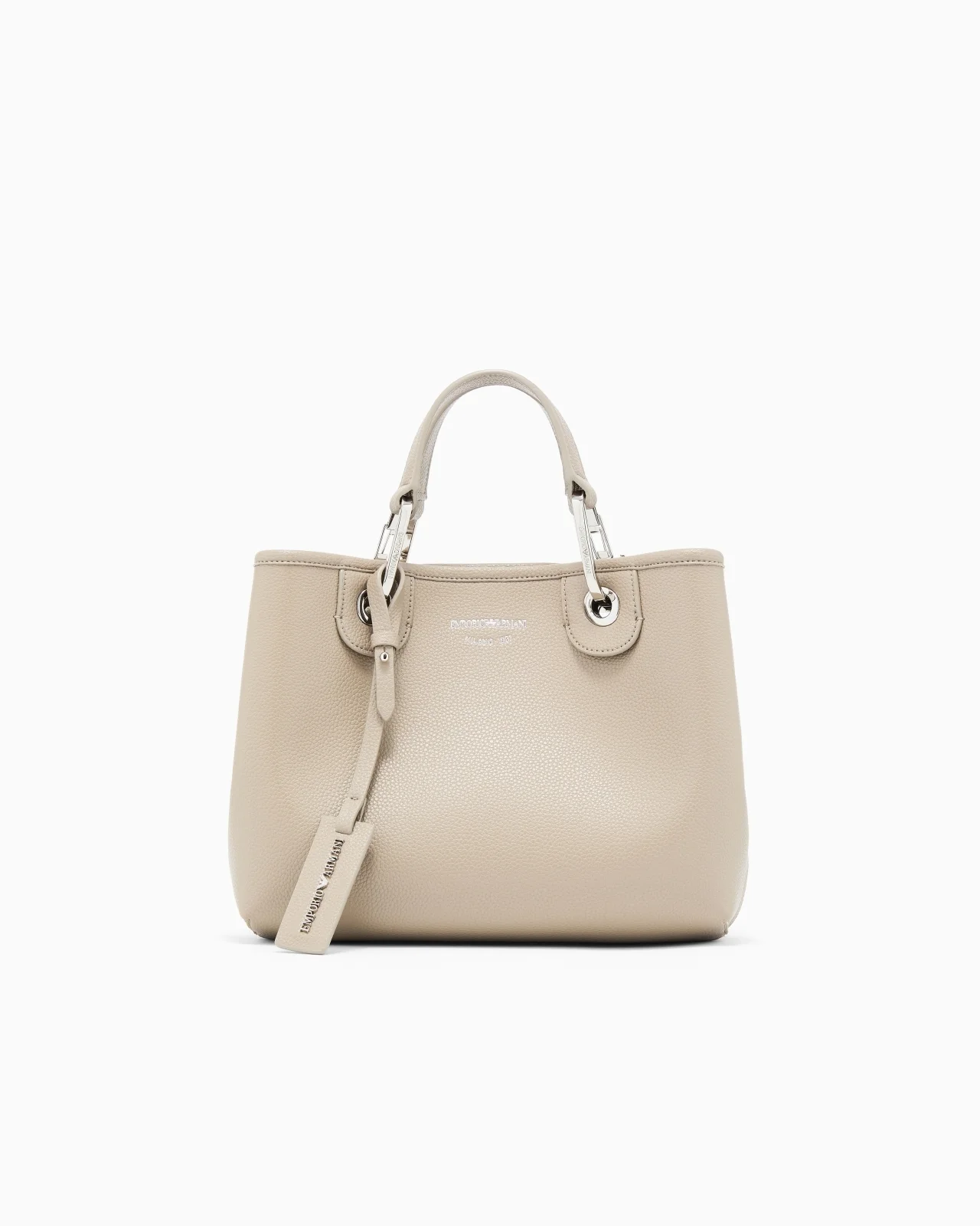 Deer-print small shopper bag with magnetic clasp. The item is embellished with removable logo snap clips and tags with embossed logo lettering that match the bag. Featuring a detachable logo chain strap and matching inner zip pouch. This item belongs to the MyEA line, the selection of iconic and exclusive Emporio Armani bags that are most representative of the label. Choose the piece and complete it with accessories from the line that suits your style. Measurements: 26 x 20 x 10 cm Deer-print finish Solid coloured Silkscreen logo Two handles Logo clips Detachable logo shoulder strap Matching internal pouch with zip Product Code: EW000361AF12036M1286