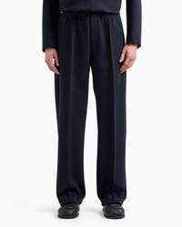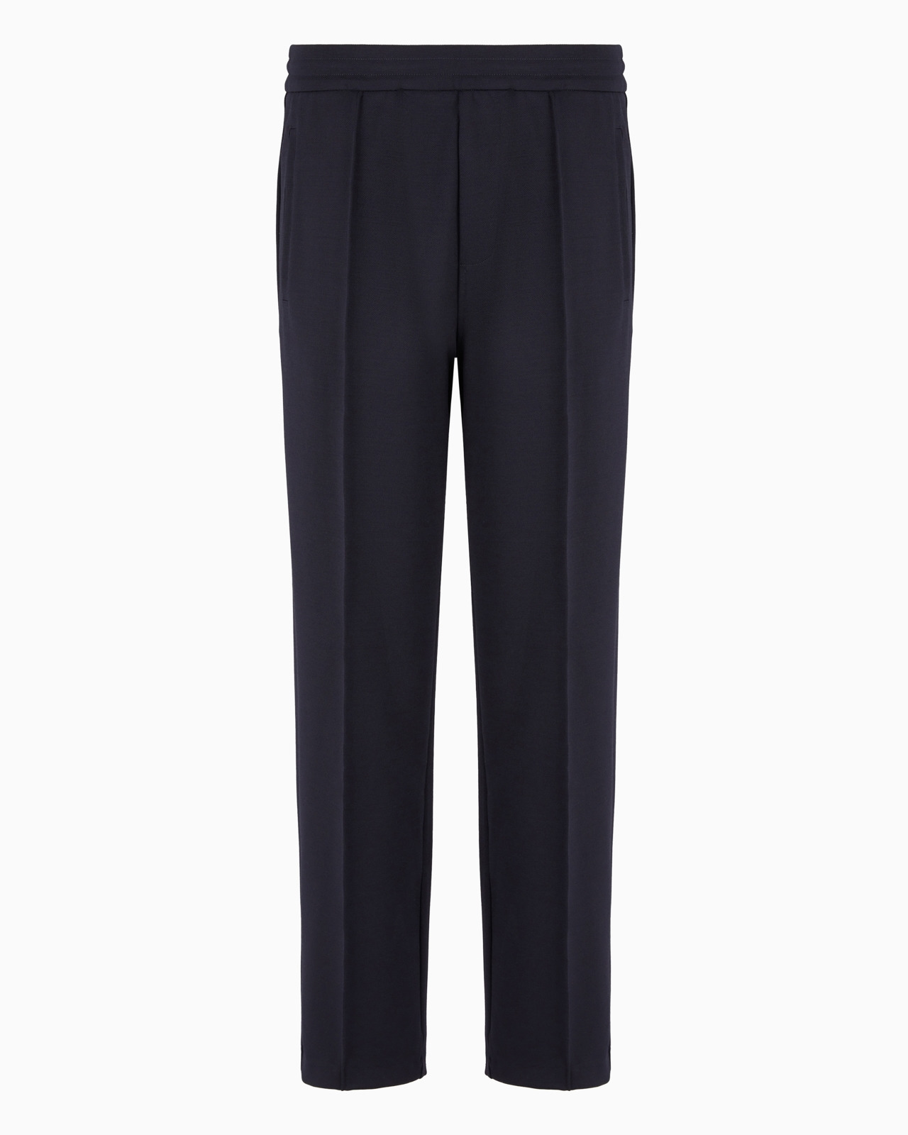 Trousers with an elastic waist and front ribs, made of a soft wool-blend cloth with a diagonal weave. A comfortable, essential and versatile garment that pairs well with casual tops and more formal and sophisticated pieces. Product Code: 6D1PK71JHQZ10920 Details Composition 74% Polyester 21% Wool 5% Elastane Cloth Diagonal weave Elasticated waist Front ribs Side inseam pockets Back welt pockets Back EA logo plate Fitting The model is 188 cm tall and is wearing size 48/M (Italian Size)