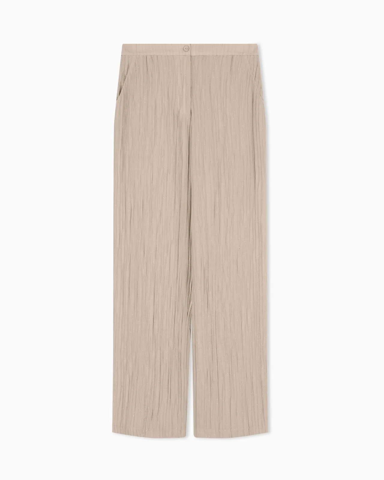 Trousers made of sparkling jacquard crepon, an all-over glitter-covered fabric that catches the light and adds a touch of sophistication to the garment. The unique texture of the jacquard creates a pleated motif for a dynamic and sophisticated visual effect. Length: 106 cm Ankle cuffs: 24 cm Sparkling crepon Jacquard Waist lined with ottoman trim Closure with zip, button and back button Side pockets with nylon lining Product Code: EW003446AF20830F1013
