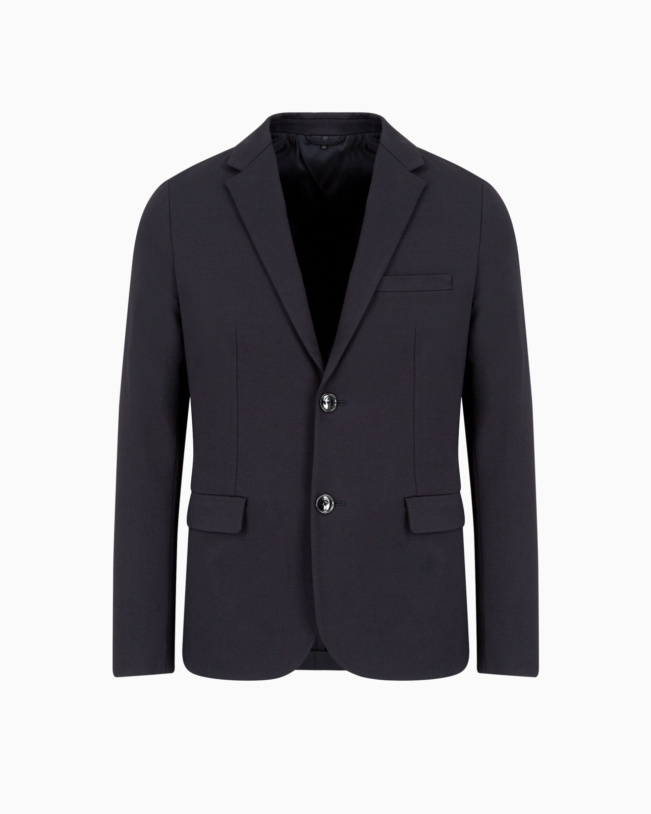 Single-breasted jacket with a classic lapel collar, side flap pockets and double back vent. This item belongs to the Essentials clothing selection, the Emporio Armani capsule collection that is an evergreen statement of style: an ongoing collection with clean, well-designed shapes for a wardrobe that meets the demands of any season. These “essential”, versatile pieces are a must-have for the male wardrobe. Product Code: 8N1G811JEZZ10920 Details Composition 63% Viscose 32% Polyamide 5% Elastane Jersey Solid color Lapel collar Single-breasted Long sleeves Two pockets 2 buttons Partially lined interior Dual back vents Single chest pocket Fitting The model is 188 cm tall and is wearing size 48/M (Italian Size)