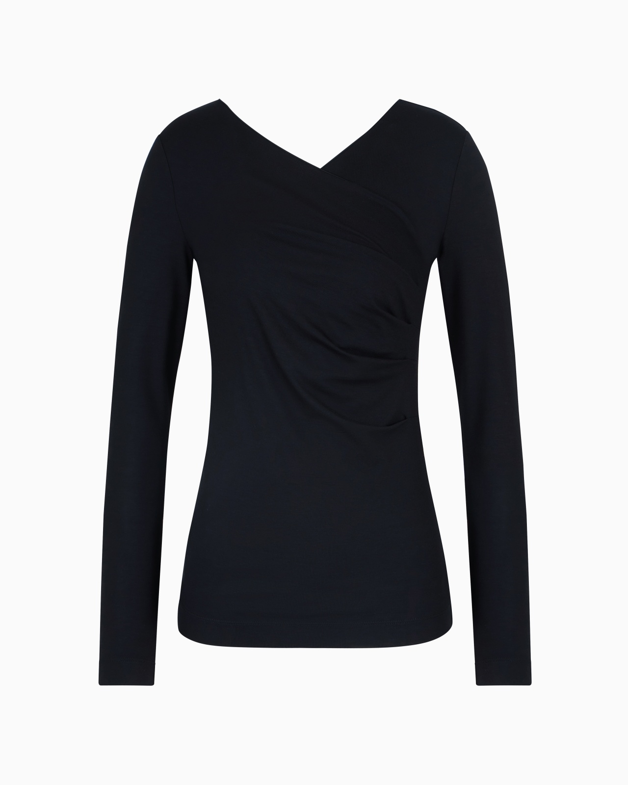 Jumper with cross-over V neck and front gathering detail, made of viscose stretch jersey fabric with a particularly fluid knit. A versatile style for morning and evening wear. Stretch jersey V neck Gathering Long sleeves Back V neck Product Code: EW000673AF12328UC001