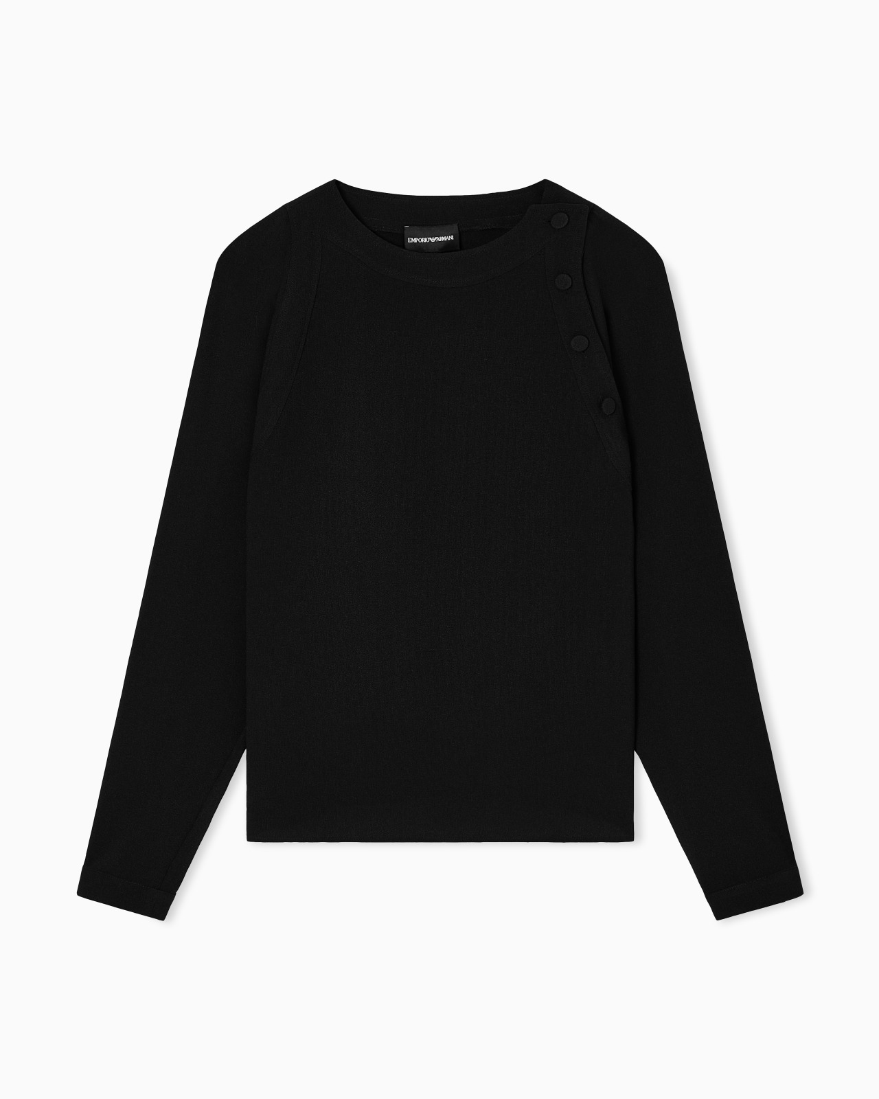 Crew-neck blouse with a special closure on the shoulder with satin buttons. Made of stretch sandblasted fabric, a smooth, sensual fabric that creates a piece designed to be worn day&night. Sandblasted fabric Crew neck Satin button closure on the left shoulder Long sleeves Product Code: EW001963AF15990UC001