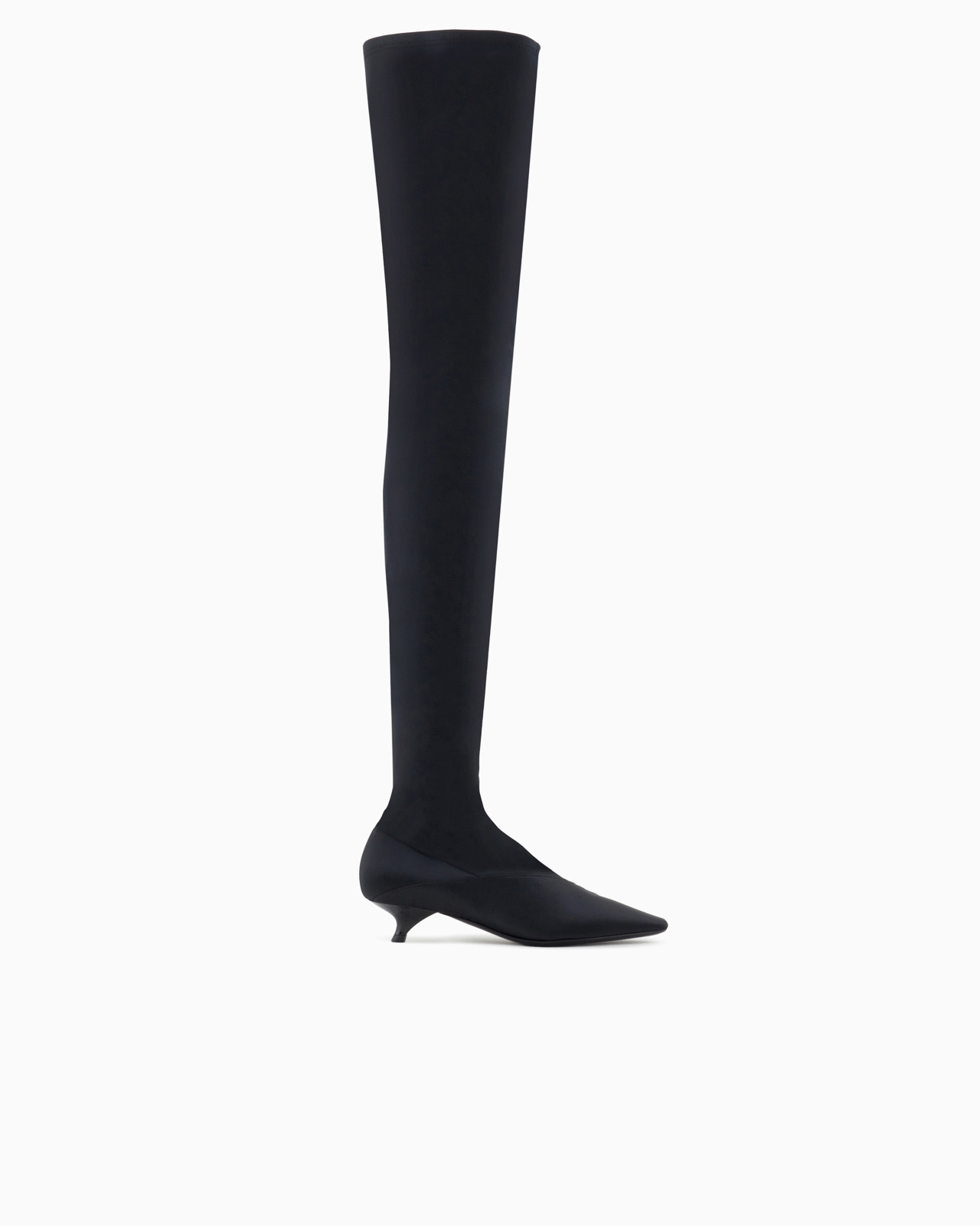 Thigh-high boots with a kitten heel made of stretch satin. An over-the-knee style that belongs to a line of footwear featuring an essential. extremely modern design. Product Code: X3O235XD435100002 Details Composition 97% Polyester 3% Elastane Heel height: 3.5 cm Stretch satin Pointed toe Kitten heel Leather soles Made in Italy
