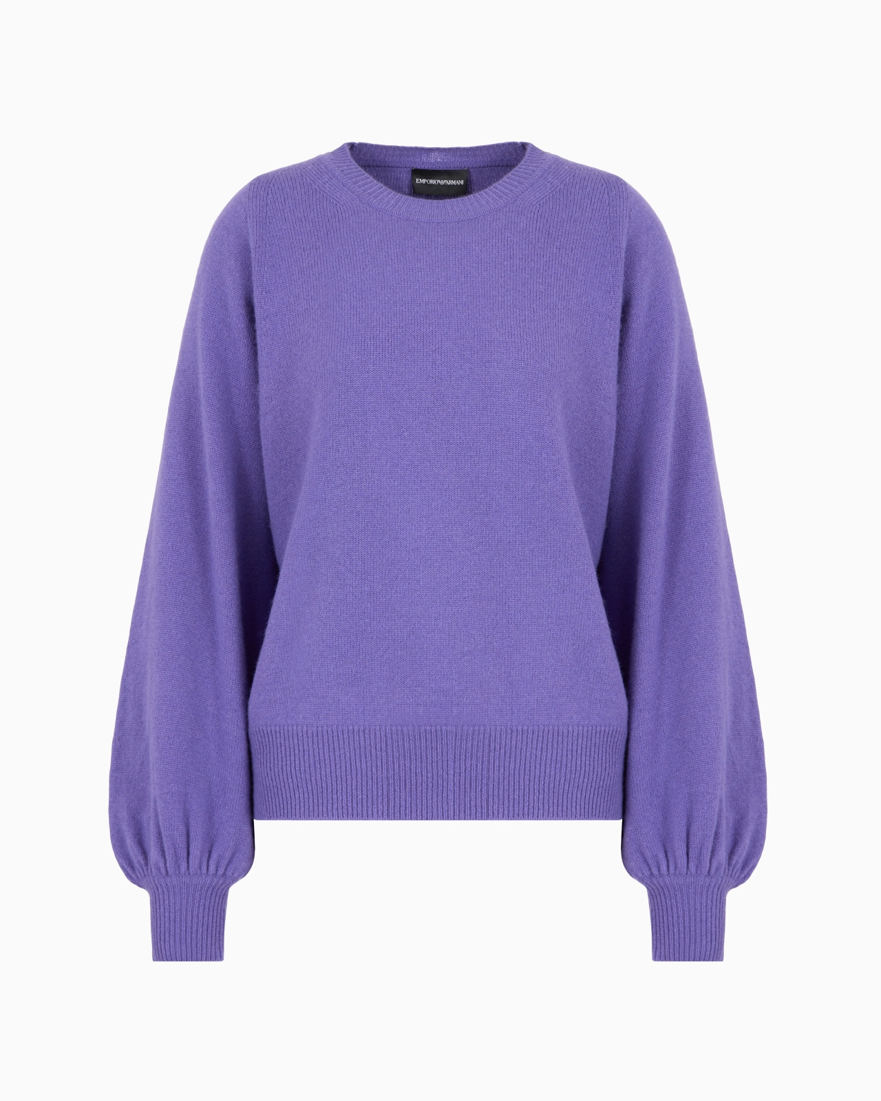 Round-neck jumper in a blend of virgin wool and cashmere, made from natural fibres from responsible farming. The style is crafted in a full-fashioned plain knit and features wide sleeves with a balloon design. Product Code: 6D2MT52M26Z10844 Details Composition 70% Virgin Wool 30% Cashmere The fabric is made of 70% wool from responsible farming Plain knit Rounded neckline Long balloon sleeves Ribbed trim Fitting The model is 178 cm tall and is wearing size 40/S (Italian Size)