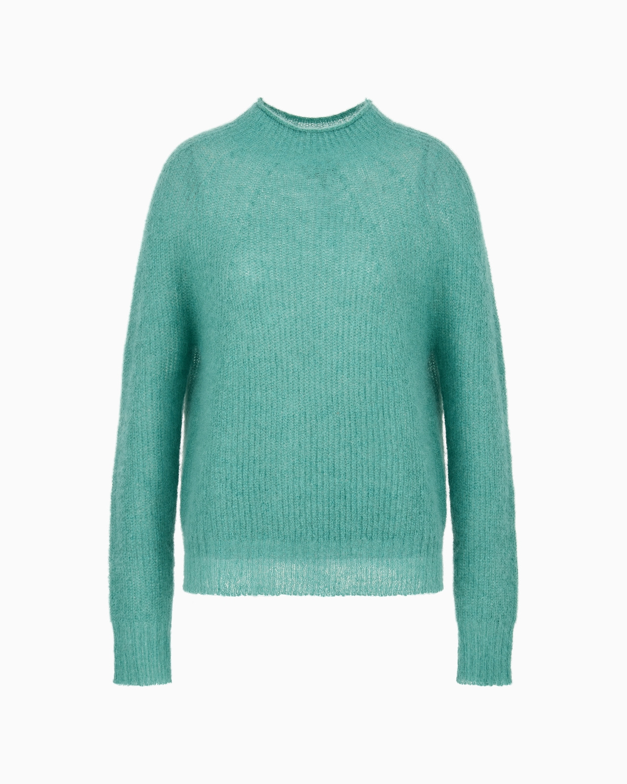 Mock-neck jumper with a warm and cocooning texture made of a wool and mohair blend. Fisherman’s rib knit on a plain-knit base makes it suitable for everyday wear. Product Code: 6D2MXI2M63Z10510 Details Composition 65% Angora wool 32% Polyamide 3% Wool Knit Fisherman’s rib Mock neck Long raglan sleeves Ribbed trim Made in Italy