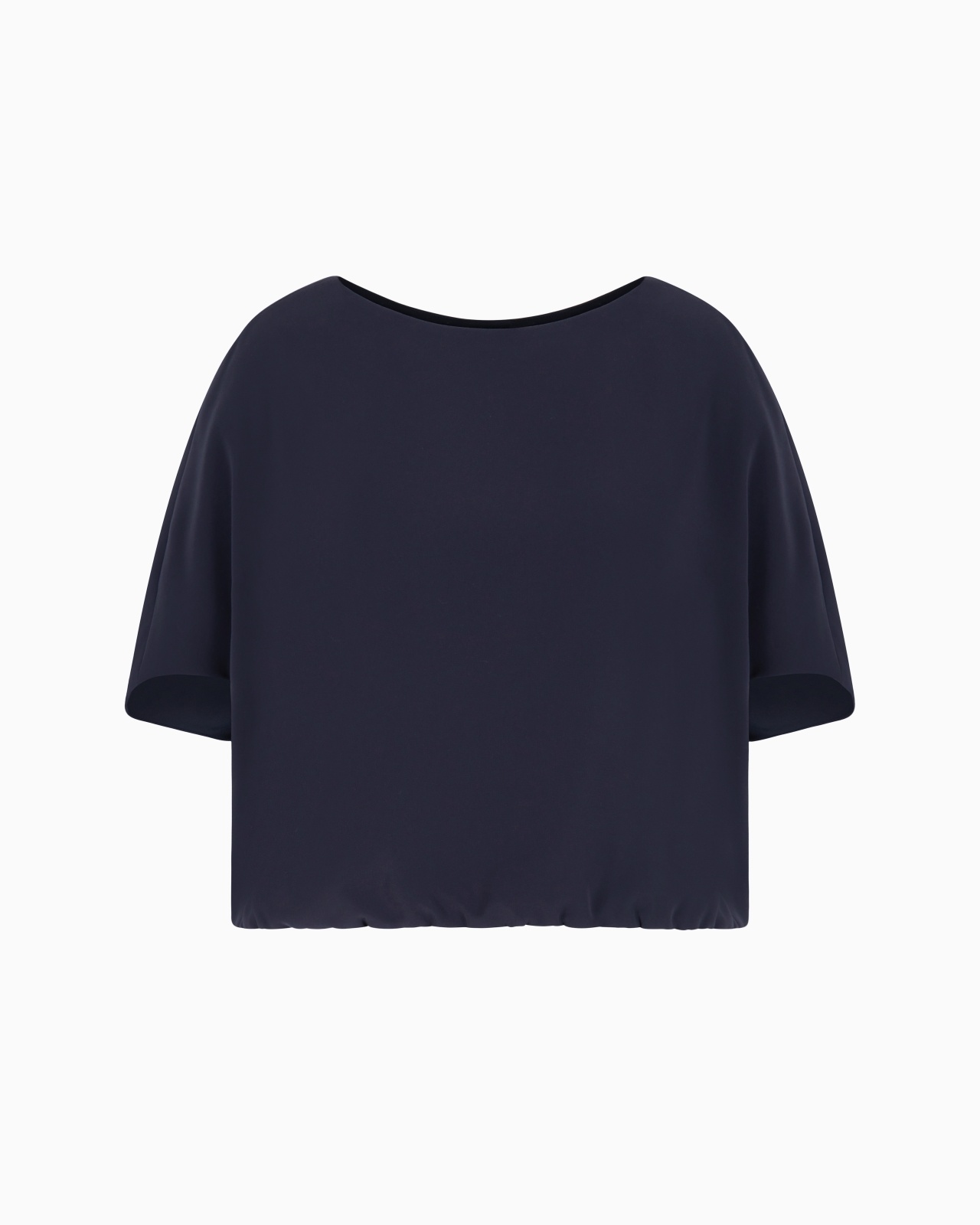 Technical cady blouse with a rounded neckline in a flowing, lightweight fabric that gently drapes across the body, offering an impeccable look to any silhouette. The style features wide sleeves with a cape-effect design and has a side press-stud opening at the gathered hem, creating a balloon effect. Tech cady Rounded neckline Short sleeves Side press studs at the hem Gathered hem Lined garment Product Code: EW000828AF10206UB115
