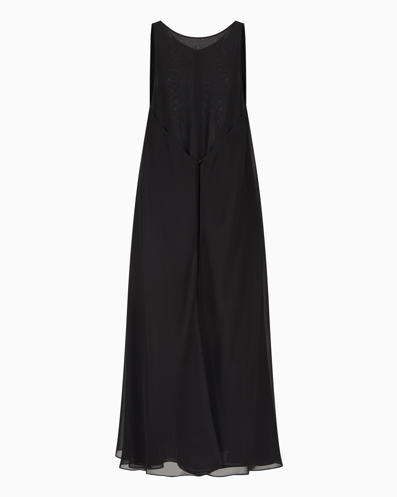 Long dress made of technical georgette. Thanks to the natural lightness of the fabric, the piece acquires femininity and airiness, while the fabric’s natural sheerness enhances the refined sensuality of the style. The style features a front panel closed with a button that adds movement and originality to the piece. Technical georgette Rounded neckline Sleeveless Front panel with button Back zip closure Product Code: EW000843AF10209UC001