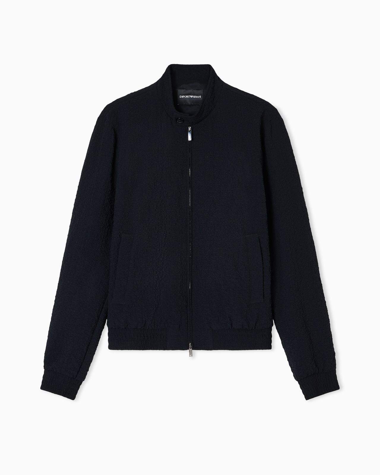 Blouson with front zip and collar with off-centre button. Made of technical seersucker with a very textured surface to look at and feel, one of Armani’s favourite textures. The ultra-lightweight fabric gives the entire piece a dynamic, crinkly feel. Length: 63 cm Seersucker Buttoned collar Zip closure Long sleeves Open side pockets Lined garment Product Code: EM000185TE17021UC001