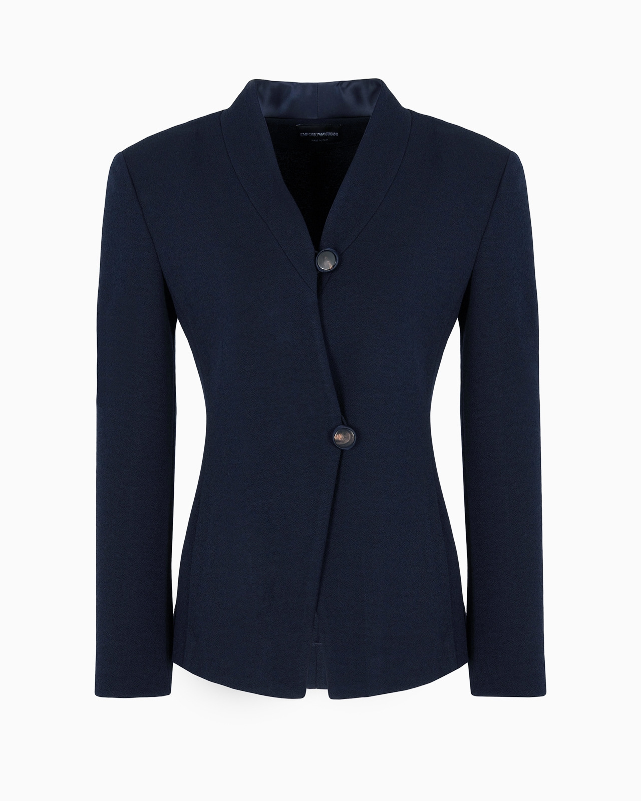 Jacket with irregular front fastening with marble-effect buttons. Made of textured wool-blend jersey with a slightly embossed finish. Product Code: 6D2G8F2JZIZ10917 Details Composition 44% Acrylic 43% Wool 11% Polyamide 2% Elastane Jersey Irregular fastening Marble-effect buttons Long sleeves Side inseam pockets Unlined garment Fitting The model is 178 cm tall and is wearing size 40/S (Italian Size)