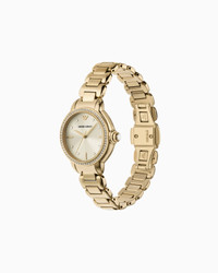 This 32mm watch features a cream sunray dial, three-hand movement and gold-tone stainless steel bracelet. Movement: Quartz/3 Hand Dial: Cream Case Size: 32mm Case Material: Stainless Steel Plating: Gold Bracelet: Gold Stainless Steel Atm: 5 Atm Product Code: AR11609NLPNLC