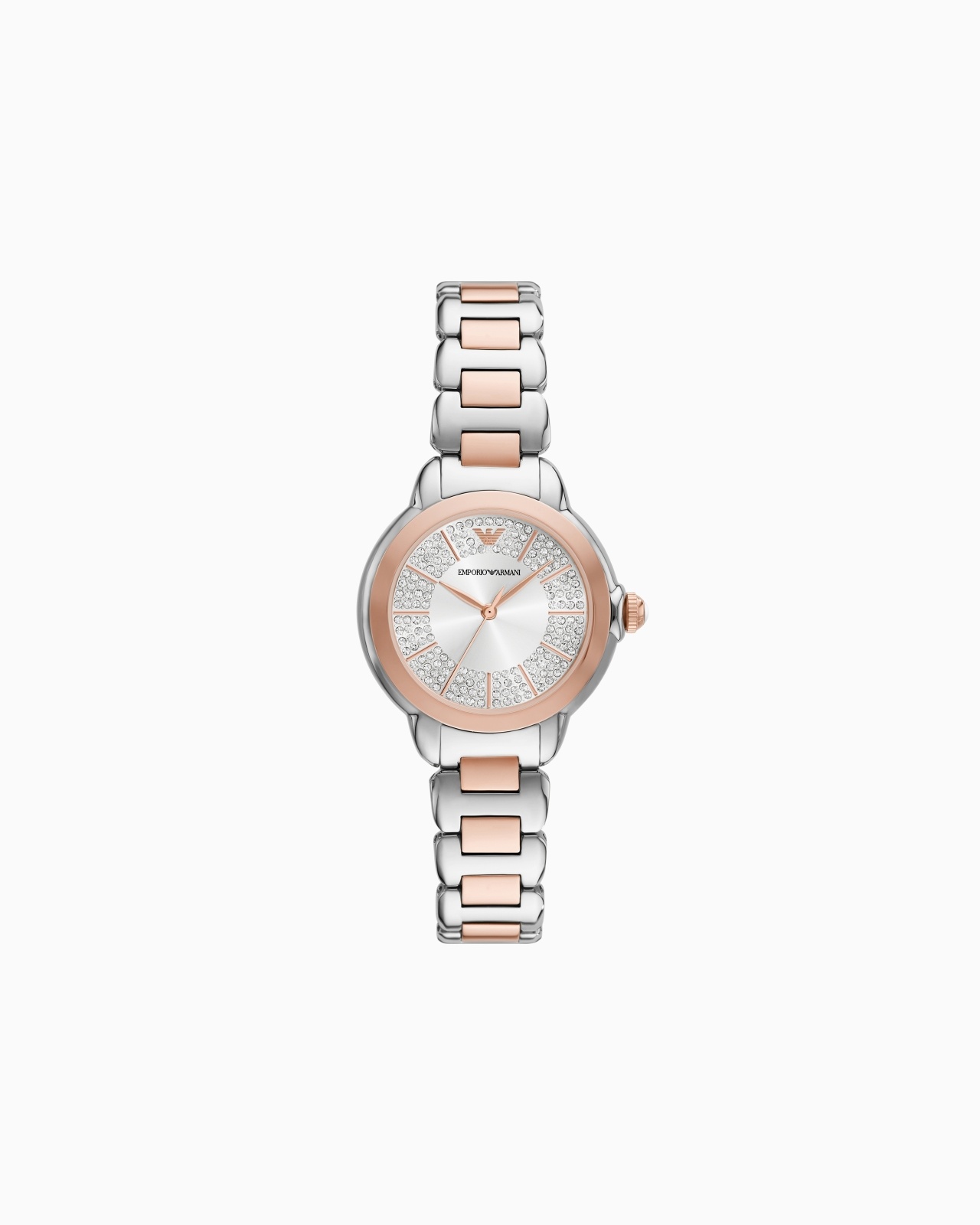 This 32mm watch features a silver sunray dial with crystal stones, three-hand movement and two-tone stainless steel bracelet. Quartz/3 Hand Silver 32mm Stainless Steel Silver 2-Tone Stainless Steel 5 ATM Product Code: AR11643NLPNLC