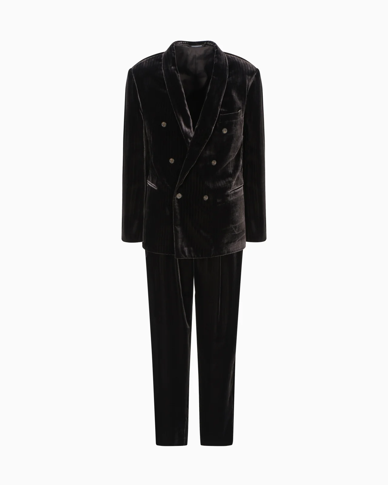 Three-piece suit consisting of a double-breasted jacket, double-breasted waistcoat and matching trousers. The jacket has a very relaxed fit with a low waist, shawl lapels, almost straight sides, and lightweight inner shoulder pads to enhance the dropped shoulders effect. The suit is made of an elegant cupro blend velvet, embellished with a unique all-over printed motif that creates a stunning play of light and dark. Relaxed fit Velvet All-over printed pattern Three-piece suit Double-breasted jacket Shawl lapels Double-welt side pockets Half-lined garment Jacket length: 73 cm Double-breasted waistcoat Side welt pockets Matching trousers Waist with belt loops Side pockets Ankle cuffs: 18 cm Made in Italy Product Code: EM003680TE17085U8137